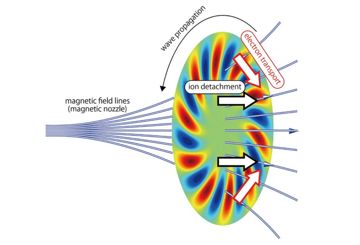 Po przeanalizowaniu szczegółowych danych z sygnałów gęstości plazmy i fluktuacji pola elektrycznego, japońscy uczeni odkryli, że spontanicznie wzbudzone fale powodują transport namagnesowanych elektronów w kierunku głównej osi dyszy magnetycznej, neutralizując odrywające się jony. Transport elektronów do wewnątrz był w rzeczywistości korzystny dla odrywania, pomagając zmniejszyć rozbieżności rozszerzającej się wiązki plazmy. To oznacza, że elektrony można wychwytywać, zwiększając tym samym siłę ciągu.