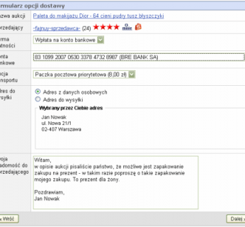 W Formularzu opcji dostawy Kupujący wybiera najdogodniejszy dla siebie sposób zapłaty i dostawy spośród akceptowanych przez Sprzedającego. Określa też adres wysyłkowy. Może podać dane do faktury, jeżeli Sprzedający ją wystawia, i wpisać wiadomość dla Sprzedającego. Po wysłaniu formularza wszystkie dane są przekazywane Sprzedającemu, a kopia wiadomości trafia do Kupującego.