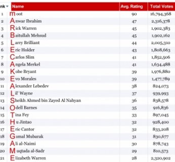 Użytkownicy 4chana dość szybko wykryli wszystkie słabości systemu i zaatakowali swoimi skryptami i spambotami. Nie minęło wiele czasu, a już najbardziej wpływową osobą w rankingu został moot, twórca kultowego już obrazkowego forum. Co więcej, pierwsze litery imion kolejnych osób z listy stworzyły kolejny, ukryty przekaz.