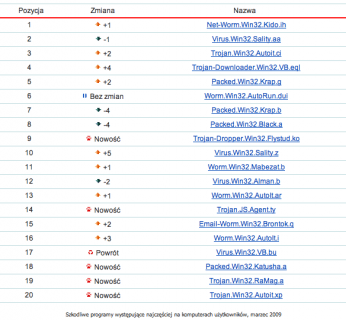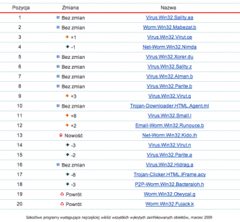 Net-Worm.Win32.Kido.ih zostawił swój ślad również w drugim rankingu, całkiem nieźle radząc sobie wśród bardziej rozpowszechnionych typów samodzielnie rozprzestrzeniających się programów. Prawdopodobnie wynika to z tego, że w marcu nie wszyscy użytkownicy zainstalowali niezbędne aktualizacje bezpieczeństwa w swoich systemach.