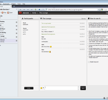 - Strefa Relaksu (The Lounge): Strefa Relaksu to samodzielny czat działający w twoim komputerze. Twoi znajomi mogą mieć dostęp do tego czatu poprzez bezpośredni link, który nie będzie od nich wymagał zakładania konta na jakimkolwiek serwisie. W zależności od twoich ustawień prywatności, możesz wprowadzić do twojego serwisu wygenerowane hasło, by mieć kontrole nad tym, kto dołącza się do twojego kanału dyskusyjnego.