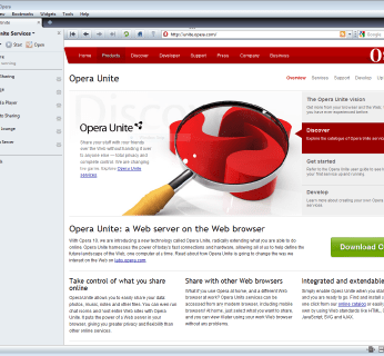 Opera Unite jest dostępna w wersji przeglądarki Opera 10, którą można pobrać na stronie http://labs.opera.com/. Usługi Opera Unite działają bezpośrednio w przeglądarce.