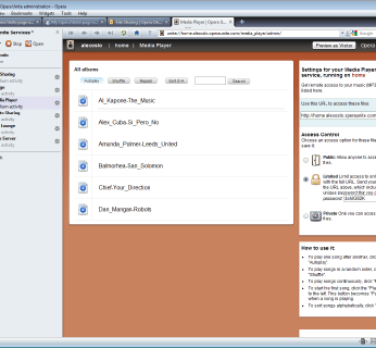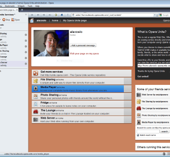 - Odtwarzacz multimediów (Media Player): Gdziekolwiek jesteś, ciesz się swoją muzyką dzięki udostępnianiu plików MP3 i listy utworów z dowolnego urządzenia. Po wybraniu folderu zawierającego twoją listę utworów, użyj bezpośredniego linku Opera Unite, by odtworzyć swoją muzykę na jakimkolwiek urządzeniu zawierającym nowoczesną przeglądarkę.