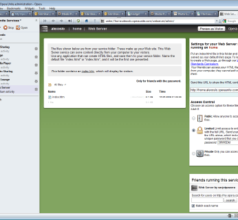 - Serwer internetowy (Web Server): Prowadź pełną stronę internetową ze swojego komputera używając serwisu Opera Unite Web Server. Po zaznaczeniu folderu zawierającego swoją stronę, możesz ją udostępnić innym używając otrzymanego adresu Opera Unite. Opera Unite automatycznie rozpozna indeks plików i stworzy stronę według twojego projektu.