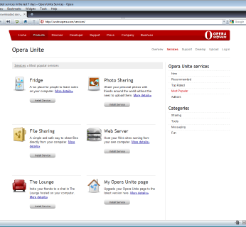 Obecnie dostępne są następujące serwisy Opera Unite: