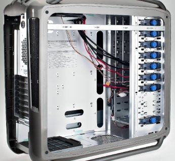 W momencie zdjęcia bocznego panelu naszym oczom ukazuje się szare, brzydkie wnętrze… Faktem jest, że jest ono bardzo przestronne. Montowanie napędów w zatokach 5.25″ (jest ich siedem) odbywa się bez konieczności używania żadnych narzędzi, do czego przyzwyczaiły nas już inne high-endowe obudowy. Po zamontowaniu płyty głównej i radiatora we wnętrzu pozostaje nadal dużo miejsca na swobodne przemieszczanie się powietrza. Trzy dyski twarde możemy zamontować w specjalnej kieszeni wyposażonej w wentylator 120 mm w diodami LED w kolorze czerwonym. Cooler Master pomyślał również o wibracjach w jakie wpadać będą dyski umieszczone w tej kieszeni i zamontował gumowe podkładki w miejscach gdzie obudowa będzie się z kieszenią stykała.