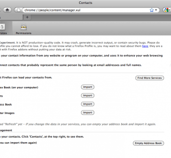 Obecna wersja dodatku obsługuje Gmaila, Gravatara, Portable Contacts, Twittera i systemową książkę adresową w Mac OS X. Rozszerzenie nie tylko w czytelny sposób prezentuje najnowsze wieści od znajomych, ale również integruje się z przeglądarką, co owocuje, na przykład, autouzupełnianiem adresu mailowego znajomego przy wpisywaniu go do jakiegoś formularza. Dodatek pozwala wpływać na udostępniane przez siebie informacje dzięki rozbudowanym opcjom dotyczącym prywatności. Komunikuje się on z aplikacjami webowymi według założeń standardu W3C Contacts API.