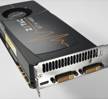 GeForce GTX 465, bo tak właśnie nazywa się nowość nVidii, jest zdecydowane bardziej “przyciętą” wersją układu GeForce GTX 470. Zmniejszeniu uległa zarówno ilość procesorów graficznych, tak zwanych CUDA Cores, z 448 do 352, taktowanie układów pamięci a także szerokość ich szyny danych (z 320 do 256-bit). Bez zmian w zasadzie pozostały tylko częstotliwości pracy GPU (607 MHz) oraz zegar jednostek cieniujących – 1215 MHz. To co cieszy, to fakt, że do dyspozycji dostajemy nadal wydajne układy pamięci GDDR5, natomiast ich ilość w prezentowanym dziś produkcie została zmniejszona do 1024 MB.