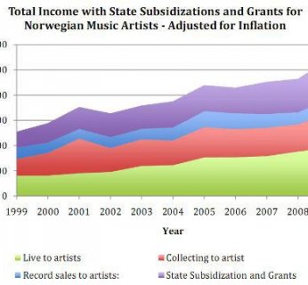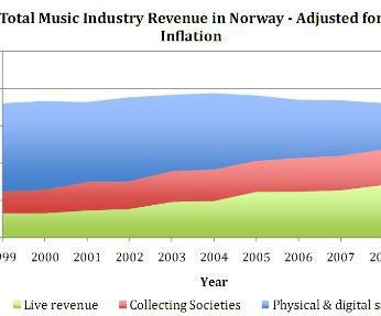Dochody norweskiego przemysłu muzycznego w 1999 roku wyniosły 1,4 miliarda norweskich koron. W 2009 roku kwota ta zwiększyła się do 1,9 miliarda. Uwzględniając inflację i inne czynniki ekonomiczne, okazało się, że sytuacja poprawiła się o cztery procent. Nie jest to wiele, ale też nie ma mowy o jakimkolwiek spadku dochodó.