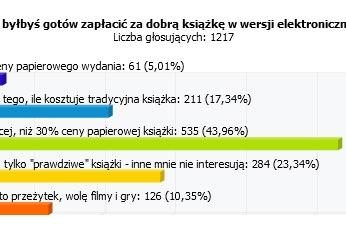 Wynika z tego, że aż 66% naszych ankietowanych (807 głosów) jest zainteresowana cyfrowymi wydaniami. Kwestią do ustalenia pozostaje cena, która w naszym kraju najprawdopodobniej wyniesie ok. 70% ceny wydania papierowego. Jak dowiedzieliśmy się nieoficjalnie, wydawnictwa nie są skłonne (nie mają możliwości?) zejść poniżej 50% dotychczasowej ceny, a do tego trzeba doliczyć podatek VAT wysokości 22%, którego nie ma w przypadku “prawdziwych” książek.