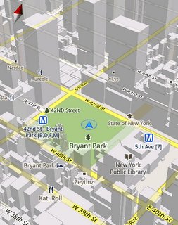 Mapy Google 5.0 nie generują już map w trybie rastrowym, jak dotąd, a wektorowym. W praktyce oznacza to, niestety, większe obciążenie dla naszego telefonu. Ale w zamian za to mamy szybsze doczytywanie fragmentów mapy i, co najważniejsze, możliwość obracania jej widoku. To szczególnie docenią kierowcy i osoby używające Map do nawigacji – widok perspektywiczny jest po prostu czytelniejszy od dwuwymiarowego. Tryb 3D można ustawiać ręcznie, lub zdać się na automat, który polega na wbudowanym kompasie. W trybie 3D generowana jest nie tylko mapa, ale też i budynki.