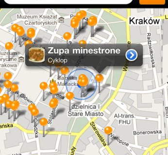iPhone przy pomocy GPS lokalizuje położenie użytkownika na mapie, a następnie pokazuje na niej zdjęcia potraw w okolicy. Mapa jest interaktywna i dynamicznie zmienia się wraz ze zmianą położenia Wyjadacza. Dzięki temu doprowadza użytkownika do jego ulubionej potrawy, zwłaszcza w miejscach, w których znajduje się po raz pierwszy. Użytkownik, który właśnie wylądował w Bangkoku, przy pomocy iPhone’a łatwo znajdzie drogę do swego pierwszego Pad Thaia.