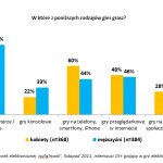 Warto zwrócić uwagę na fakt, że w gry elektroniczne grają zarówno kobiety (72%), jak i mężczyźni (78%). Widoczne są jednak między nimi różnice w wyborze sprzętu do gier. Mężczyźni częściej korzystają z konsol (33%) niż kobiety (22%), panie natomiast preferują gry na telefonach komórkowych/smartfonach (kobiety 60%, mężczyźni – 44%) oraz na serwisach społecznościowych (odpowiednio 28% i 15%).
