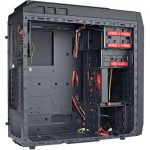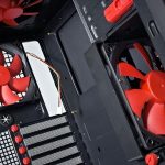 Wnętrze obudowy to kolejny plus Libry LF-01B. W jej wnętrzu znajdziemy między innymi aż pięć (!) wentylatorów 120 mm (dwa na górze, po jednym z przodu oraz z tyłu oraz jeden wewnątrz). Uwagę przyciągają ich czerwone łopatki, a także pozostałe elementy w tym kolorze – śrubki oraz zatrzaski w zatokach 5,25″ oraz 3,5″. Dyski twarde w obudowie montujemy bez konieczności użycia śrubek przy pomocy dołączonych sanek. Dla dysków 2,5″ producent przewidział montaż przy pomocy specjalnego mocowania przy koszyku dysków 3,5″. W tym jednak wypadku będziemy zmuszeni użyć dwóch śrubek.