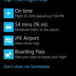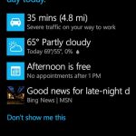 Cortanę możemy przypiąć sobie do ekranu startowego w formie aktywnego kafelka lub uruchamiać ją za pomocą sprzętowego przycisku wyszukiwania. Po jej uruchomieniu możemy wypowiedzieć do niej polecenie lub zapytanie lub je wpisać. Cortana będzie też proponowała zapytania czy polecenia, które jej zdaniem, być może, chciałeś lub chciałaś wydać, a także prezentowała na ekranie informacje, które jej zdaniem są ci w danej chwili potrzebne, takie jak pogoda, utrudnienia w ruchu drogowym na trasie do twojej pracy i wiele więcej.