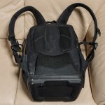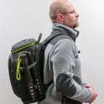 Z tyłu plecaka umieszczone zostały dwa wyściełane pasy, pozostawiające miejsce na wentylację w okolicach kręgosłupa, oraz trzecie, szersze miękkie wytłoczenie u dołu. Same pasy naramienne również są wystarczająco szerokie i sztywne, by można było oczekiwać dość wysokiego komfortu noszenia plecaka. Ale niestety, bez jakiegoś owijania w bawełnę muszę stwierdzić, że to najmniej wygodny plecak (jakikolwiek, nie tylko fotograficzny), jaki zdarzyło mi się nosić w ciągu ostatnich kilku lat.
