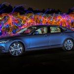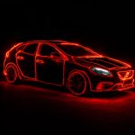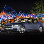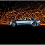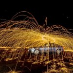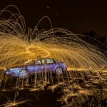 Koniec dnia nie oznaczał jednak końca warsztatów. Wręcz przeciwnie – dopiero w tym momencie rozpoczęły się na serio ćwiczenia z wykorzystaniem szeroko pojmowanych technik “malowania światłem”. Tym razem malowane były znów najnowsze Volvo S90 i V40, zaś zamiast pędzli uczestnicy warsztatów używali wielu rodzajów latarek i laserów, a także ognia rozpalonego na specjalnych konstrukcjach metalowo-kewlarowych. Ta część warsztatów zakończyła się w sposób naturalny i nieuchronny, bo… na dworze znów zaczynało się już robić jasno.