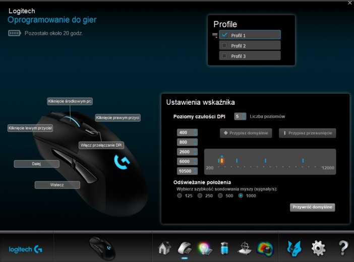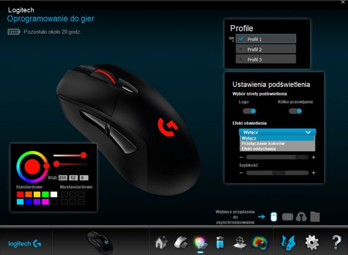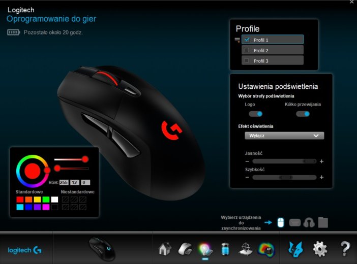 A jak z zapotrzebowaniem na energię? Przy pełnym naładowaniu mysz potrafi przepracować od 22-32 godzin w zależności od ustawień związanych z podświetleniem. Ja ładowałam ją co trzy doby. Na szczęście w trakcie ładowania można z myszy normalnie korzystać, a sam proces uzupełnienia energii do 100 proc. nie zajmuje więcej niż 2 godziny. Pytanie tylko brzmi, czy jest sens co trzy dni wyciągać z szuflady kable, by podładować sprzęt, który równie dobrze może na tym kablu pracować cały czas. Ja nigdy nie byłam fanką bezprzewodowych myszek, ale jeśli widok przewodów na biurku was drażni, to dość częste ładowanie tego gryzonia pewnie będzie was złościć (stąd zapewne pomysł na technologię PowerPlay).