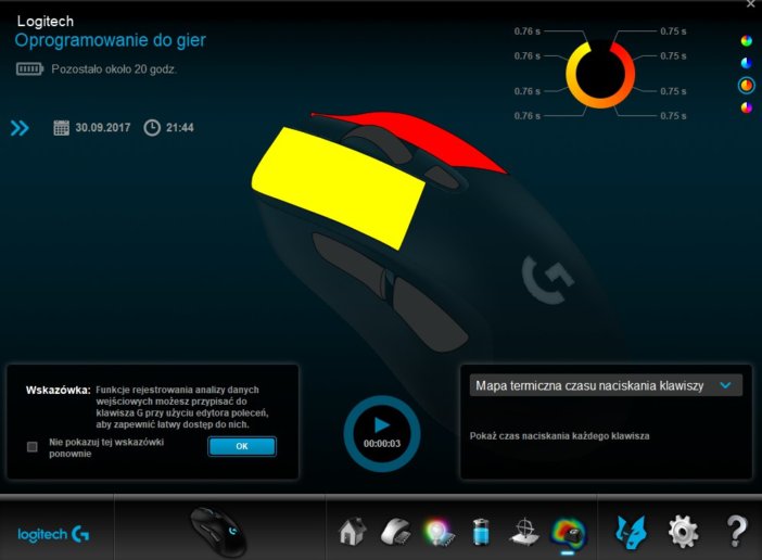 Oprogramowanie działa stabilnie i jest intuicyjne w użyciu, choć oferuje też nieco przekombinowane opcje, np. termiczną mapę czasu naciskania klawiszy czy dostrajanie precyzji czujnika myszy do podkładki. Oczywiście znajdziemy tu bardziej “przyziemne” opcje, takie jak możliwość mapowania przycisków, tworzenia makr, ustawiania do pięciu poziomów DPI i edycji podświetlenia. Ta ostatnia przedstawia się dość skromnie na tle konkurencji. Do wyboru mamy jedynie efekt statyczny, automatyczne przejście kolorów (niestety własnych gradientów nie da się dodać) i efekt oddychania. Barwy można dopasować osobno dla scrolla i logotypu producenta.