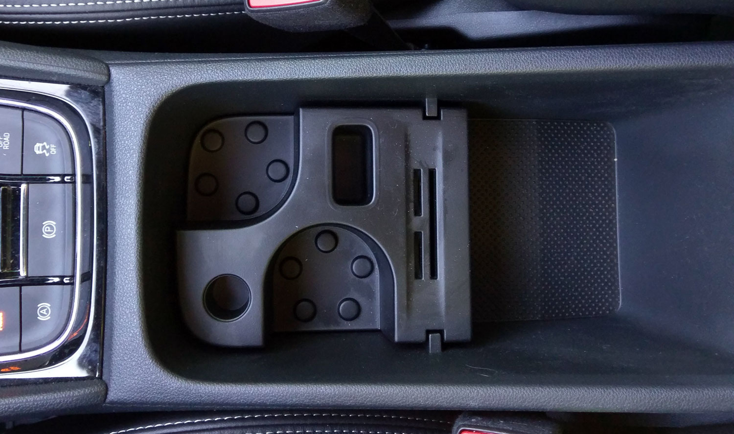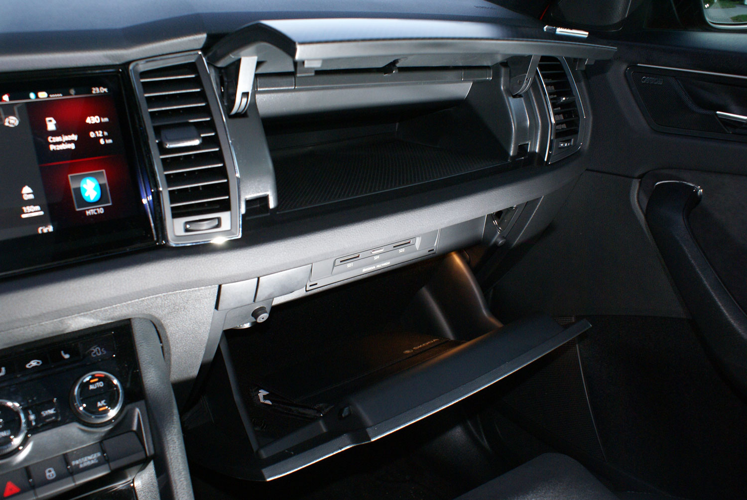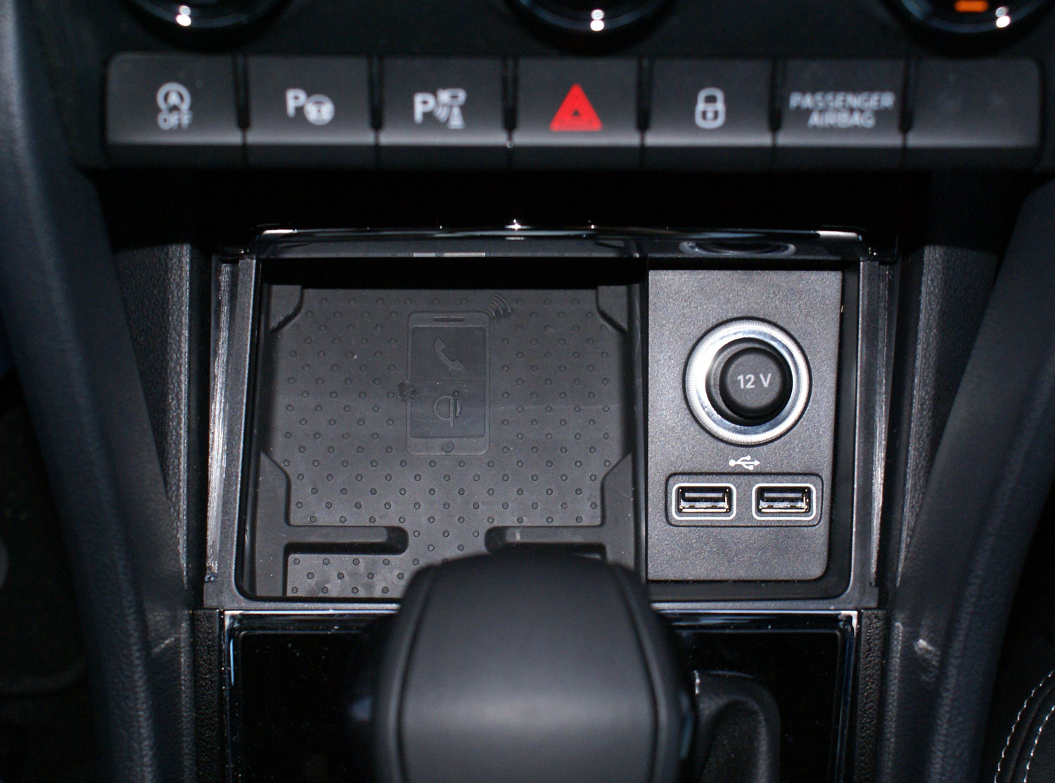 Wnętrze Kodiaqa skrywa wiele różnego typu praktycznych schowków, znajdziemy je m.in. po lewej stronie kierowcy nieco poniżej kierownicy, w podłokietniku, na konsoli środkowej, przed siedzeniem pasażera z przodu (aż dwa), no i oczywiście pokaźne kieszenie we wszystkich czterech drzwiach. W podłokietniku co prawda nie znaleźliśmy żadnego złącza USB (a to dość częsta lokalizacja takiego gniazda), ale nie można pod tym względem niczego Kodiaqowi zarzucić. Kierowca i pasażer z przodu mają do swojej dyspozycji dwa gniazda USB, gniazdo 12 V i ładowarkę indukcyjną Qi umieszczoną w niewielkim schowku w dolnej części konsoli środkowej (przed gałką skrzyni biegów).