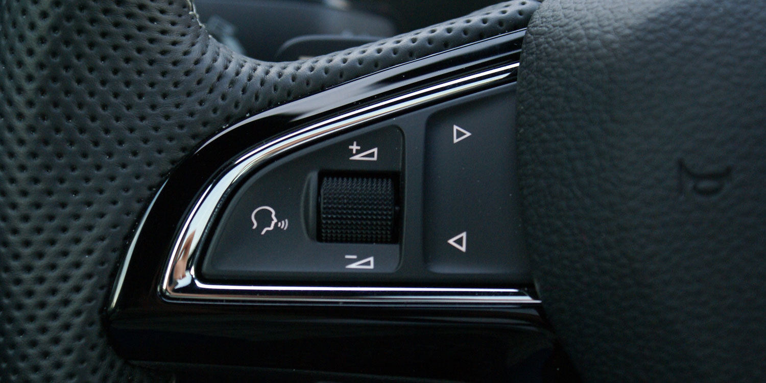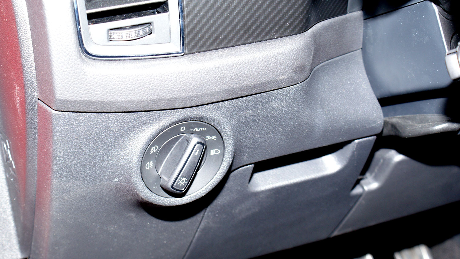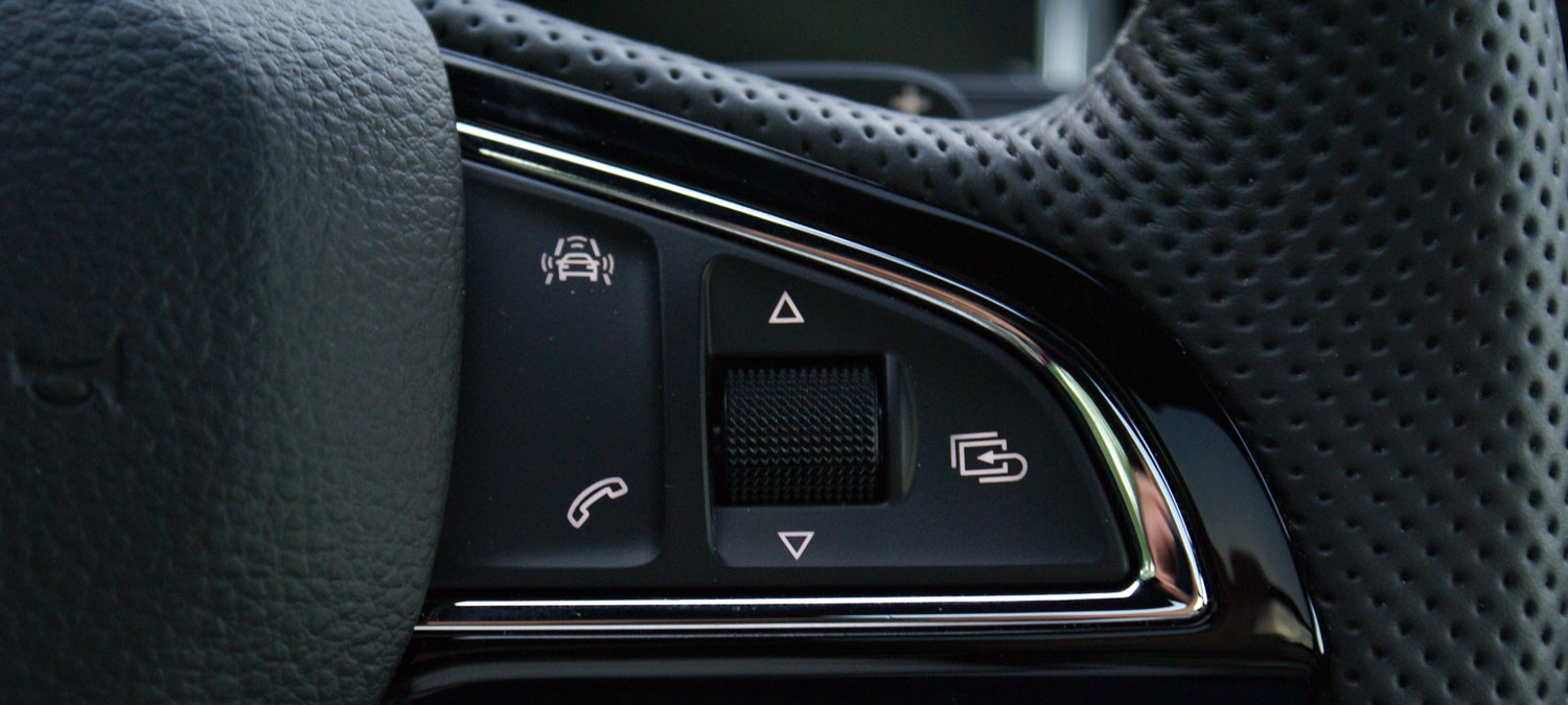 Po lewej stronie kierowcy – w standardowym miejscu – znajduje się przełącznik świateł. Dzięki temu że Kodiaq Sportline jest w standardzie wyposażany w reflektory Full LED z funkcją adaptacji świateł AFS kierowca po ustawieniu przełącznika świateł na pozycji “Auto” może o nim zapomnieć (może z wyjątkiem sytuacji, kiedy trzeba załączyć światła przeciwmgielne). Samochód automatycznie wykryje zmianę jasności otoczenia i potrafi zmienić LEDy do jazdy dziennej na właściwe światła mijania np. podczas zapadania zmroku czy w tunelu. Ale skoro już zaczęliśmy temat rozwiązań wspomagających kierowcę podczas prowadzenia auta, czas dokładniej przyjrzeć się im dokładniej.