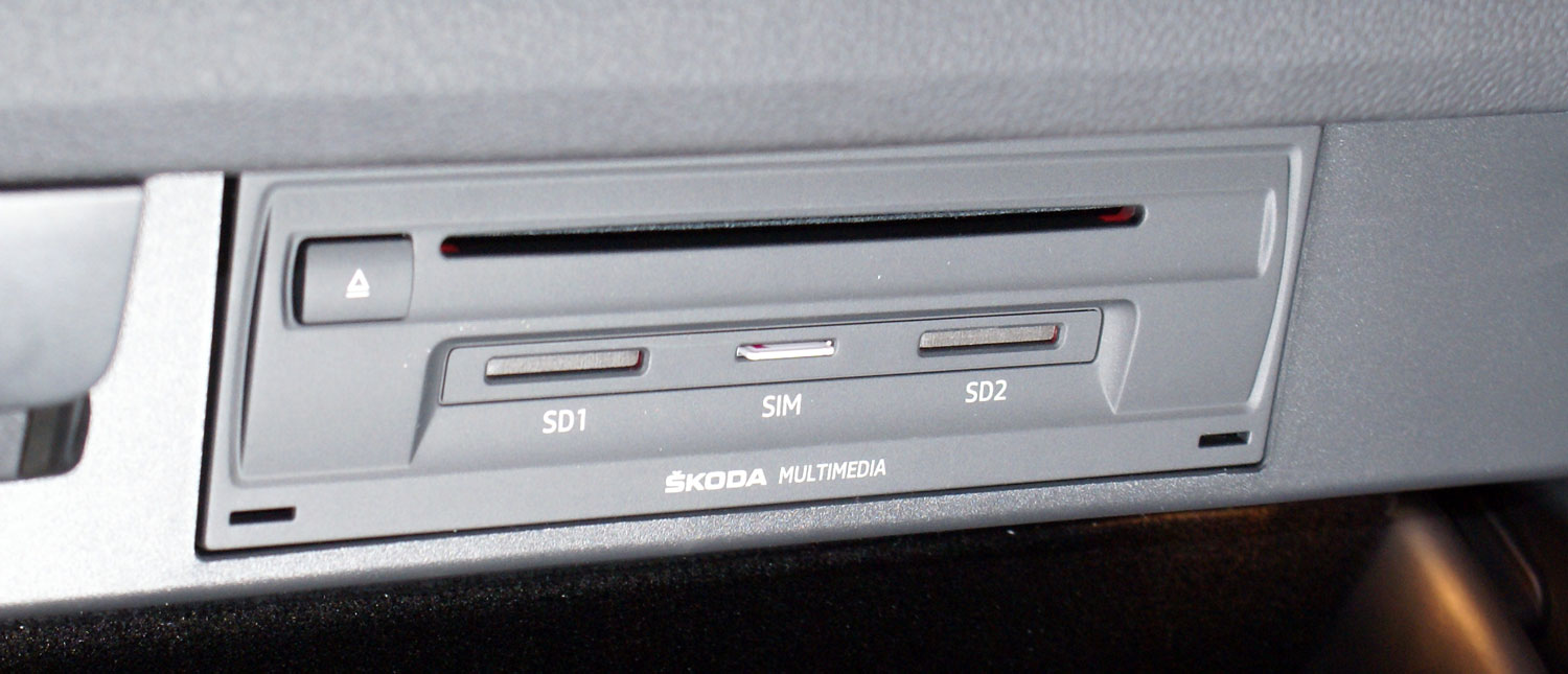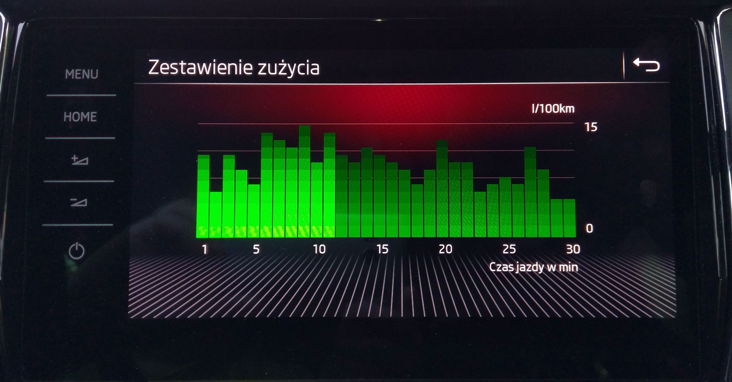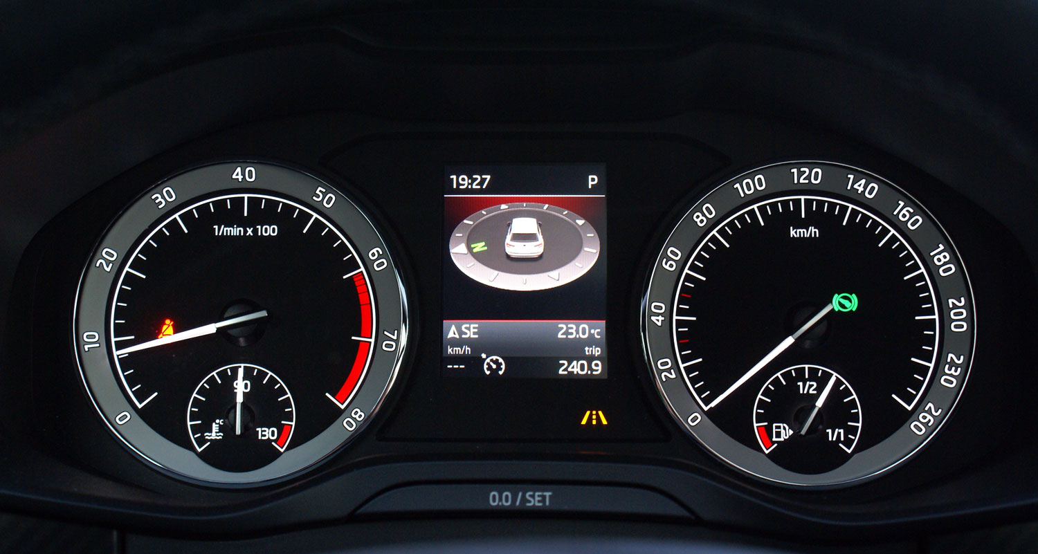 Škoda zdecydowała się na rozwiązanie łączące tradycyjne zegary (prędkościomierz, z wskaźnikiem poziomu paliwa oraz obrotomierz z wskaźnikiem temperatury chłodziwa silnika) z umieszczonym pomiędzy nimi panelem cyfrowym z kolorowym ekranem LCD oraz diodami sygnalizującymi różne funkcje pojazdu. Zawartość ekranu LCD widocznego w tym miejscu może być oczywiście dopasowana do naszych preferencji. Na powyższym zdjęciu ekran ten prezentuje wskazania nawigacji, wyświetla symbol znaku drogowego rozpoznany przez pokładowy system Travel Assist (rozpoznawanie znaków drogowych to opcja w cenie 300 zł), status systemu start-stop (automatyczne wyłączanie silnika podczas postoju – wyposażenie standardowe), zegarek, aktualnie włączony bieg, wskazanie kompasu, temperaturę zewnętrzną, łączną długość podróży itd. Zamiast tego można wyświetlić np. kontaktu z telefonu listę uaktywnionych systemów asystujących kierowcy, nazwę aktualnie słuchanej stacji radiowej lub utworu z innego źródła i wiele więcej.