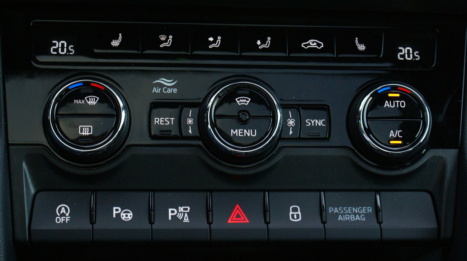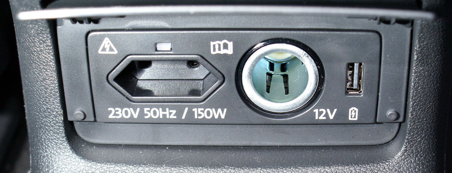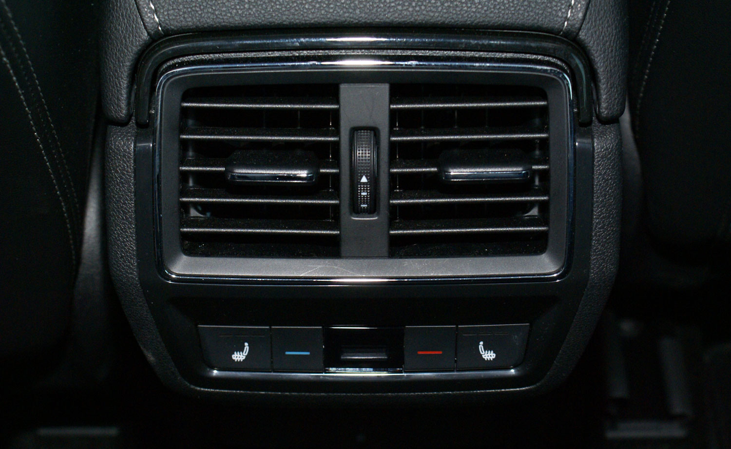 Ładowarka indukcyjna z przodu to część pakietu Bluetooth Premium z obsługą WLAN, rSAP, LTE z anteną zewnętrzną i wzmacniaczem sygnału GSM – całość kosztuje 2200 zł. Osoby siedzące na tylnej kanapie znajdą gniazdka elektryczne (12 V, USB oraz gniazdo 230 V) pod tylnym panelem klimatyzacji regulującym jej trzecią strefę. Trzeba jednak pamiętać, że tak duża liczba złączy to po części zasługa wyposażenia dodatkowego. Wspomniane gniazdko 230 V i USB w tylnej części podłokietnika (dostępne dla pasażerów tylnej kanapy) to opcja w cenie 800 zł, w standardzie otrzymamy gniazdko 12 V. Również tylny cyfrowy panel regulacji trzeciej strefy klimatyzacji to wyposażenie ponadstandardowe – trójstrefowa klimatyzacja automatyczna Climatronic to opcja za kwotę 1100 zł, ale nie znaczy to że na wyposażeniu standardowym wersji Sportline nie ma klimatyzacji – jest, tyle że dwustrefowa.