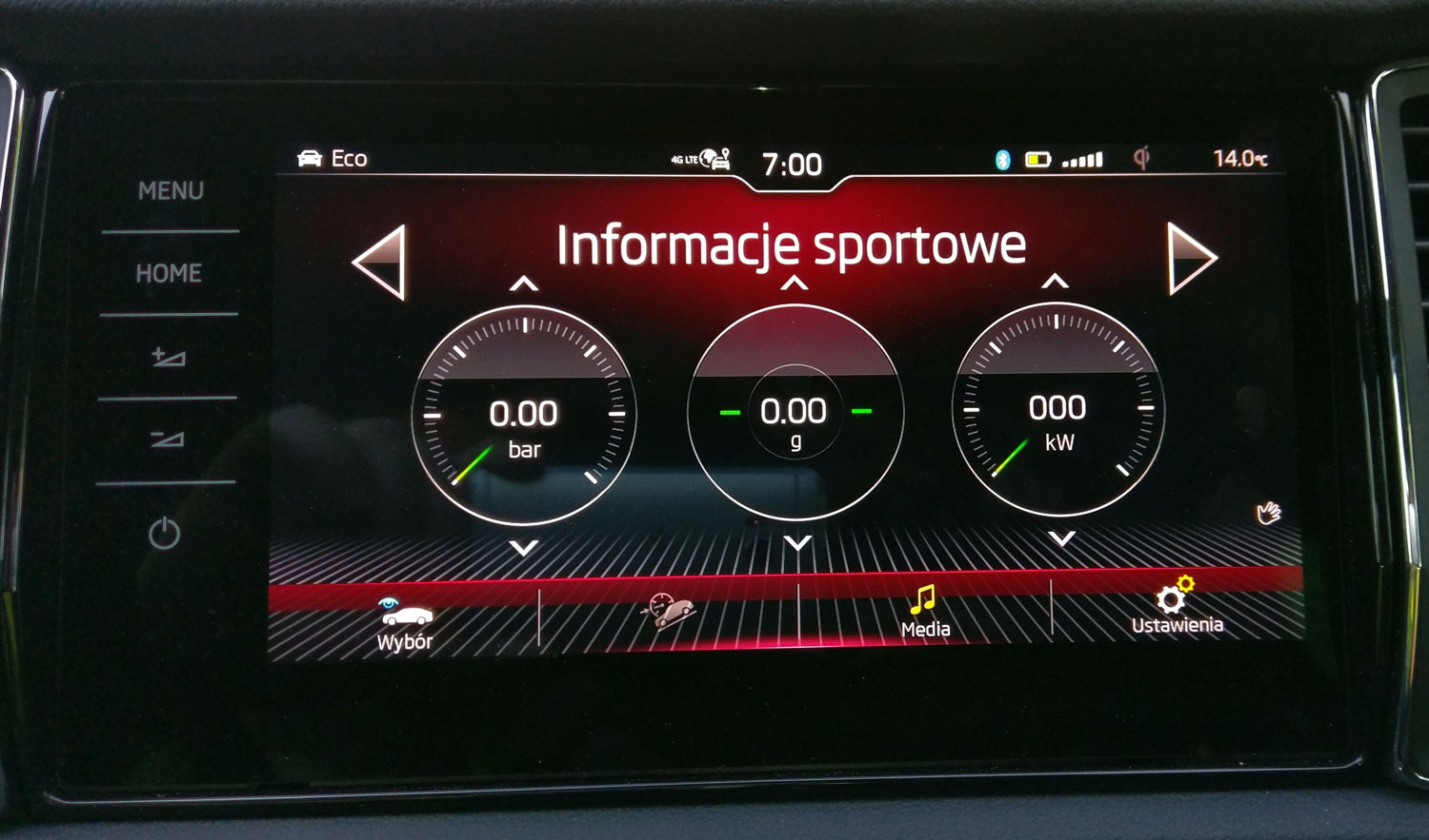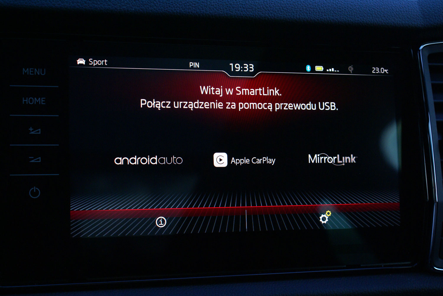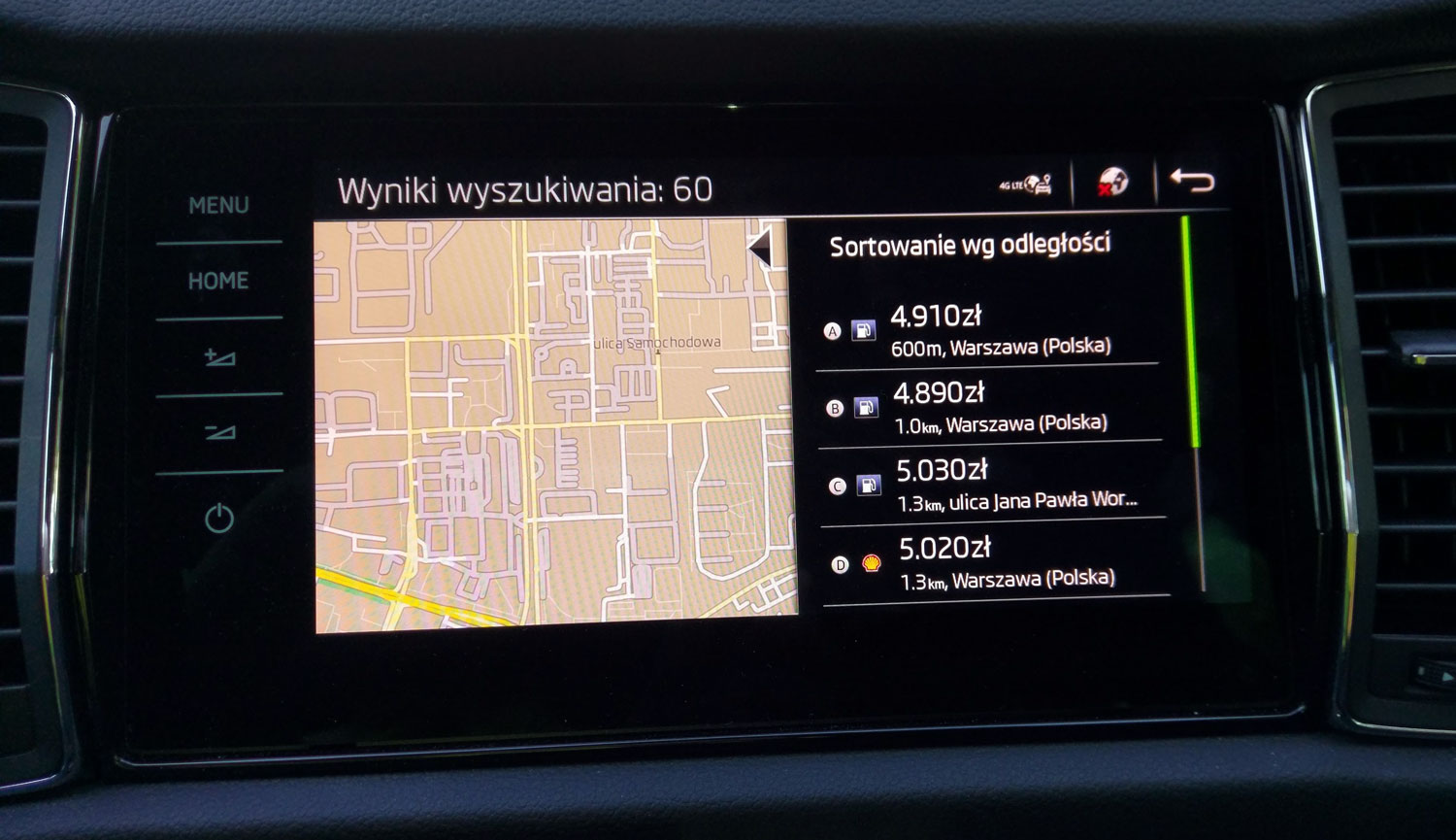 Największym ekranem w kabinie testowanego Kodiaqa Sportline jest 9,2-calowy ekran opcjonalnego systemu nawigacji satelitarnej Columbus z obsługą głosową, mapą Europy i interfejsem pokładowego systemu informacyjno-multimedialnego. To opcja w cenie 5700 zł. Oczywiście ekran ten służy nie tylko do nawigacji, w poniższej galerii możecie zobaczyć kilka przykładów jego wykorzystania. Po kliknięciu w zdjęcie w galerii zobaczycie powiększone ujęcia z podpisami wyjaśniającymi co w danej chwili jest wyświetlane. Podpowiemy jeszcze, że sterowanie funkcjami wyświetlanymi na tym ekranie możliwe jest poprzez interfejs dotykowy, a także poprzez sterowanie głosem (w języku polskim). Za pomocą komunikatów głosowych możemy ustawiać cele w nawigacji (bywa, że auto źle zrozumie wypowiedzianą nazwę ulicy, ale w większości przypadków to działa poprawnie), czy np. wywoływać połączenia telefoniczne z listy kontaktów sparowanego z pojazdem smartfonu.