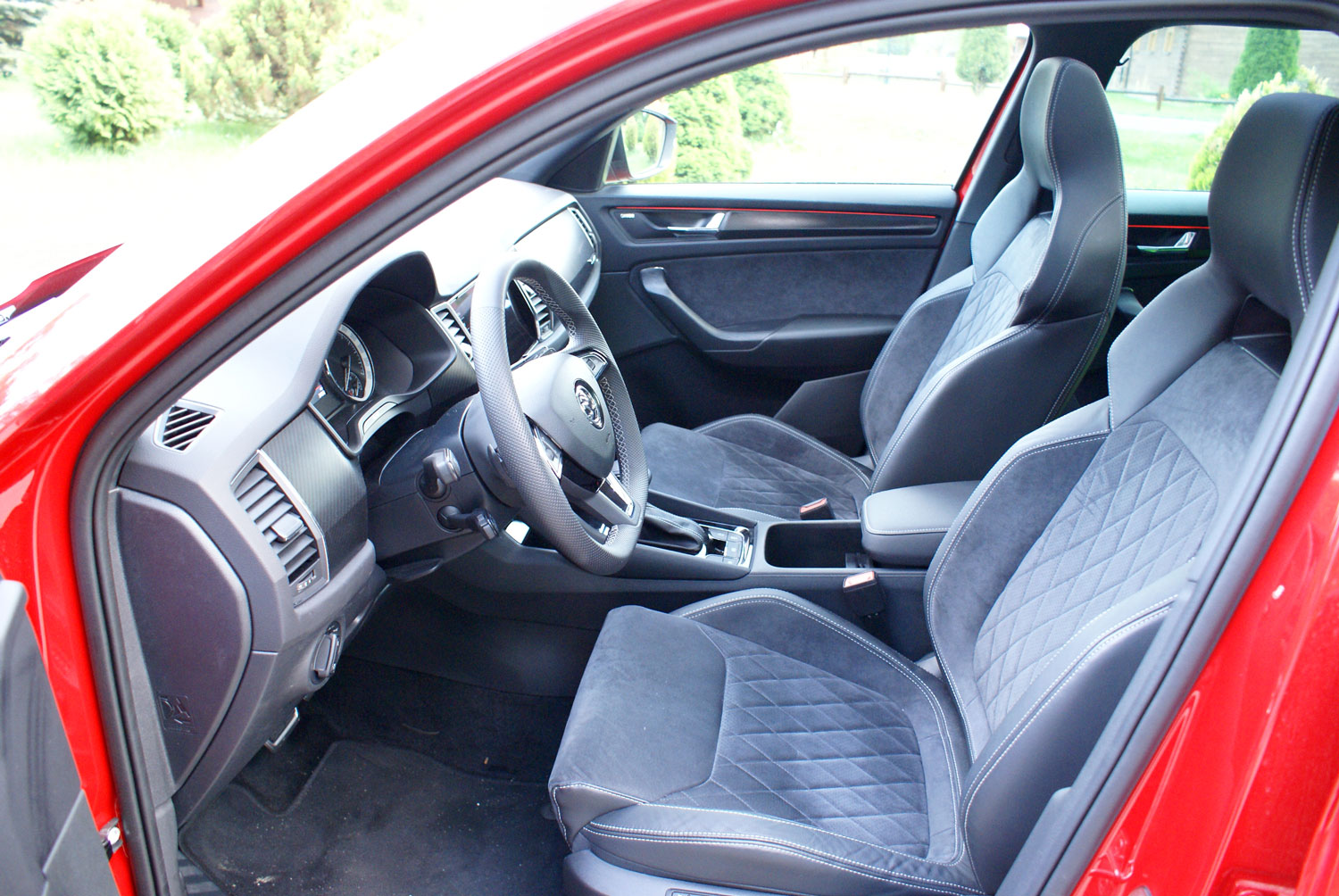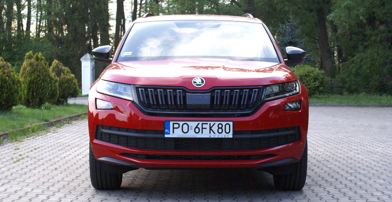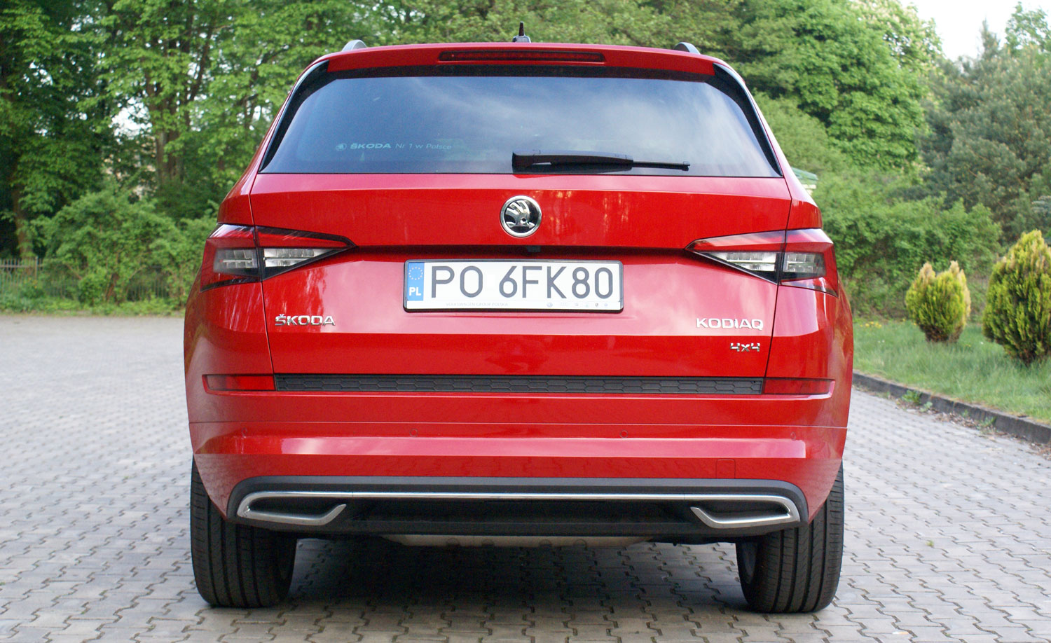 Škoda Kodiaq jest autem dużym. Długość nadwozia to 4700 mm, szerokość, wraz z lusterkami bocznymi ponad 2 metry (2087 mm), a wysokość 1685 mm (wraz z relingami dachowymi). Pod względem gabarytów auto jest bardzo zbliżone do VW Tiguana Allspace’a, różnice są znikome. Kodiaq jest minimalnie (o zaledwie 4 mm) krótszy od Allspace’a, nieznacznie (o 7 mm) węższy i o włos (dokładniej: o 2 mm) wyższy od auta ze znaczkiem VW. Cechą charakterystyczną najnowszych projektów Škody są ostro zarysowane reflektory, zarówno tylne jak i przednie, nie inaczej jest w Kodiaq. Zarówno tylne jak i przednie światła to pełne LED-y. Czerwona barwa testowanego egzemplarza to lakier określany przez producenta jako Czerwień Velvet – wymaga dopłaty 3000 zł. Nietrudno zauważyć również charakterystyczne, antracytowe, 20-calowe obręcze kół ze stopów lekkich. Te felgi noszą w katalogu Škoda Auto nazwę VEGA 8J x 20″ i stanowią wyposażenie opcjonalne z oponami 235/45 w cenie 2600 zł.