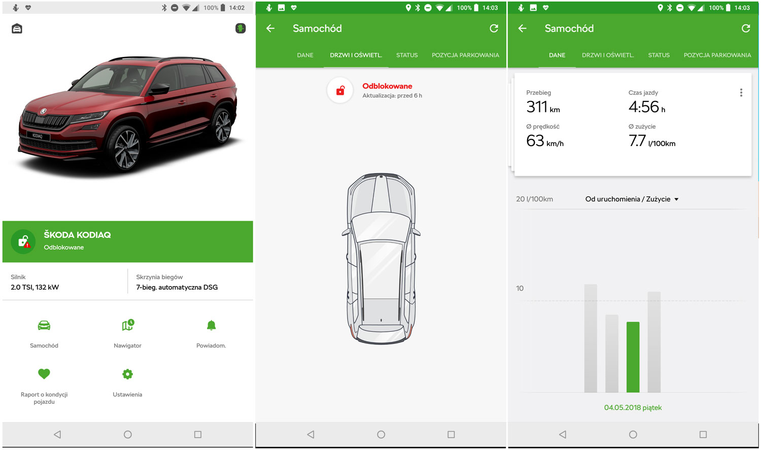 Co właścicielowi Kodiaqa daje aplikacja Škoda Connect? Ekran główny daje dostęp do informacji o pojeździe, ustawieniach nawigacji, powiadomieniach o przekroczeniu prędkości czy wyjeździe lub wjeździe do ustawionego wcześniej obszaru. Ponadto za pomocą aplikacji możemy wygenerować raport o stanie pojazdu, a także sprawdzić statystyki jazdy, przebiegu, zużycia paliwa czy średniej prędkości. Przydatną funkcją byłaby również przekazywana przez aplikację informacja na temat statusu pojazdu, czyli np. tego czy drzwi są zamknięte, światła zgaszone itp. Byłaby, gdyby działała poprawnie. Na jednej z powyższych ilustracji jest zrzut ekranu z aplikacji, na którym widać że testowy Kodiaq jest otwarty. Cóż, nie był. Aplikacja odczytała stan istotnie jeszcze w czasie kiedy auto było otwarte, ale kiedy wysiedliśmy z samochodu i go zamknęliśmy, stan ten nie został należycie zaktualizowany i później jak go sprawdzaliśmy, w apce pojazd wciąż był oznaczony jako “otwarty” choć tak nie było.