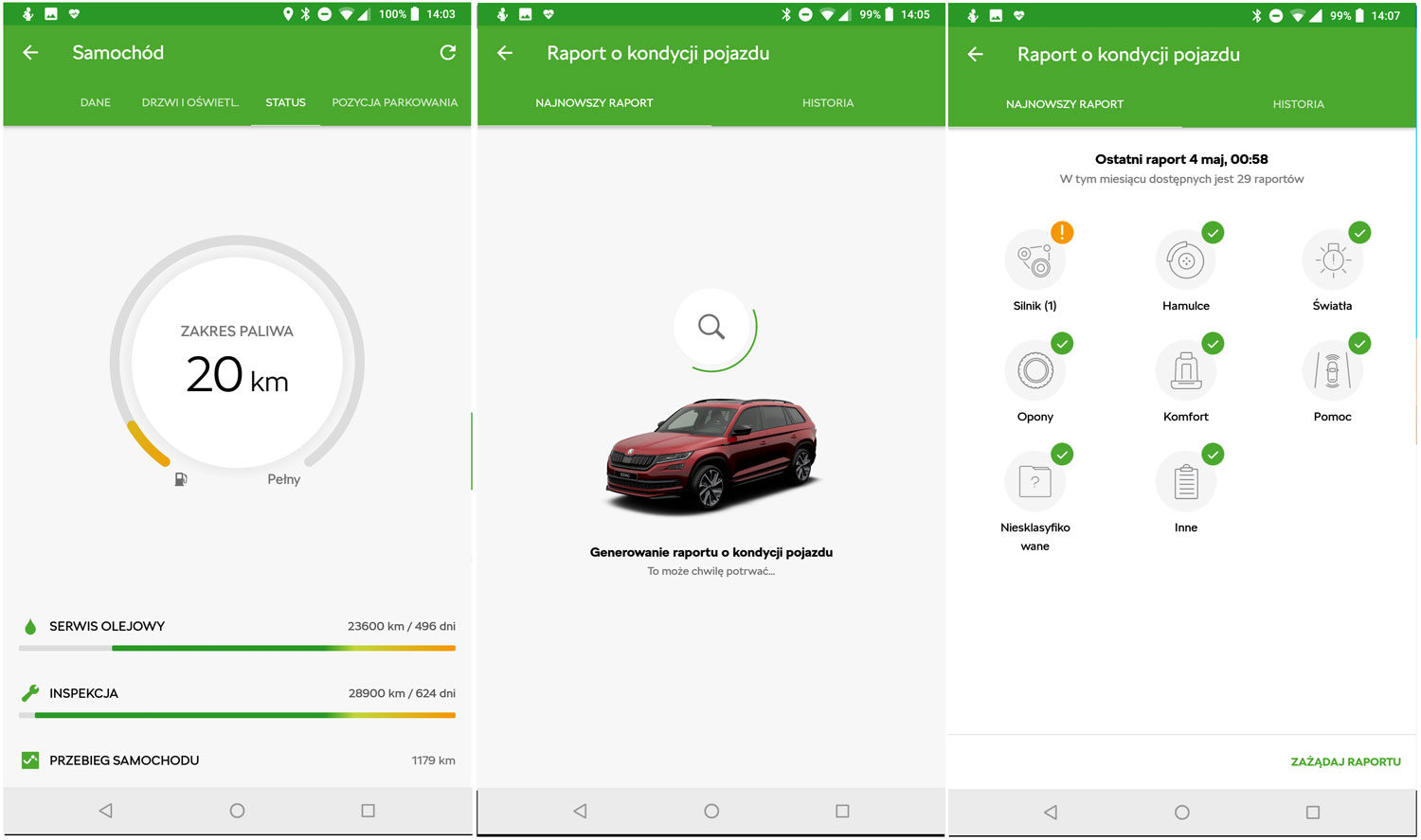 Auto nie pozwala nam o sobie zapomnieć również, gdy już z niego wysiądziemy. Wszystko to dzięki aplikacjom mobilnym. Sprawdziliśmy w działaniu aplikację Škoda Connect, która w połączeniu z uaktywnionymi wcześniej usługami Škoda Connect w samym pojeździe pozwala właścicielowi Kodiaqa pozyskiwać dodatkowe informacje również zdalnie, choć nie zawsze działało to zgodnie z oczekiwaniami.