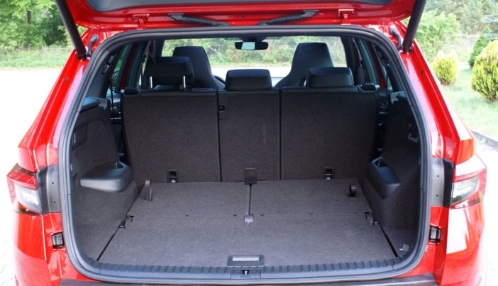Škoda Kodiaq to nie jest auto dla samotnika. Testowany egzemplarz był wyposażony w dodatkowy, trzeci rząd siedzeń, z podłokietnikiem w drugim rzędzie i podwójną podłogą bagażnika. To również opcja kosztująca 4000 zł. Oznacza to, że mamy w tym przypadku do czynienia z autem siedmioosobowym, zapewniającym wygodną podróż dla pięciu osób i dwójki dzieci. O ile miejscem na nogi można manipulować przesuwając tylną kanapę (drugi rząd siedzeń) do przodu lub do tyłu, to w trzecim rzędzie jest zauważalnie mniej miejsca nad głową niż w drugim rzędzie, stąd taki, a nie inny wniosek.