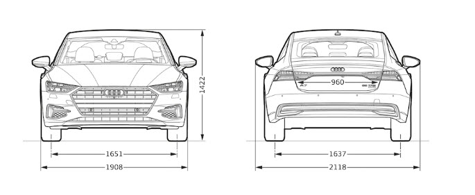 Najnowsze A7 to potężne auto, długość nadwozia tego sportbacka to niemal 5 metrów (dokładnie 4969 mm), szerokość – prawie 2 metry (1908 mm) i to bez bocznych lusterek.
