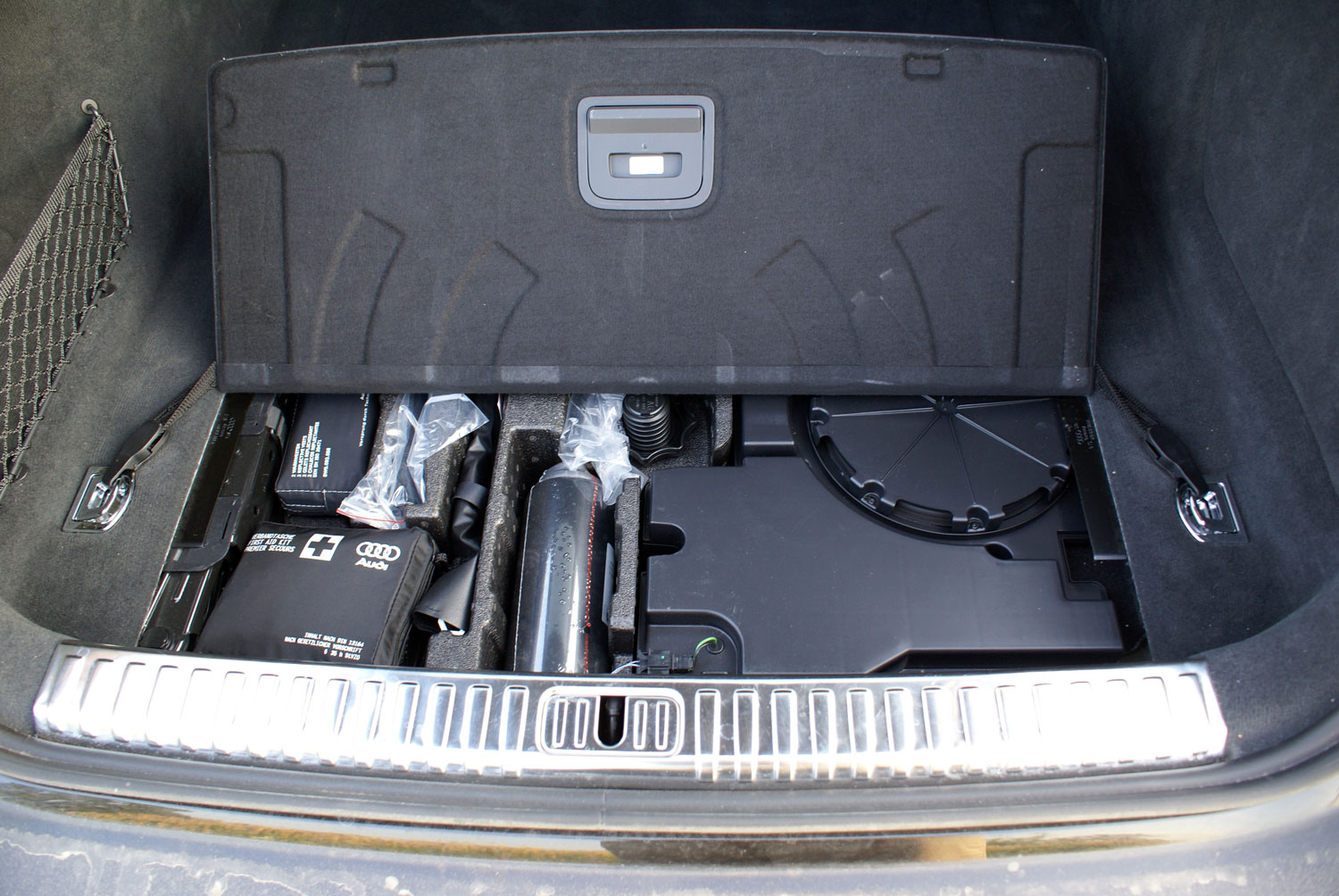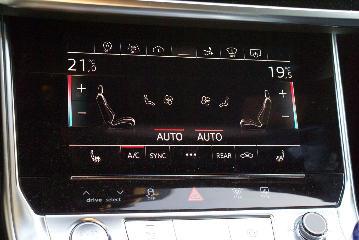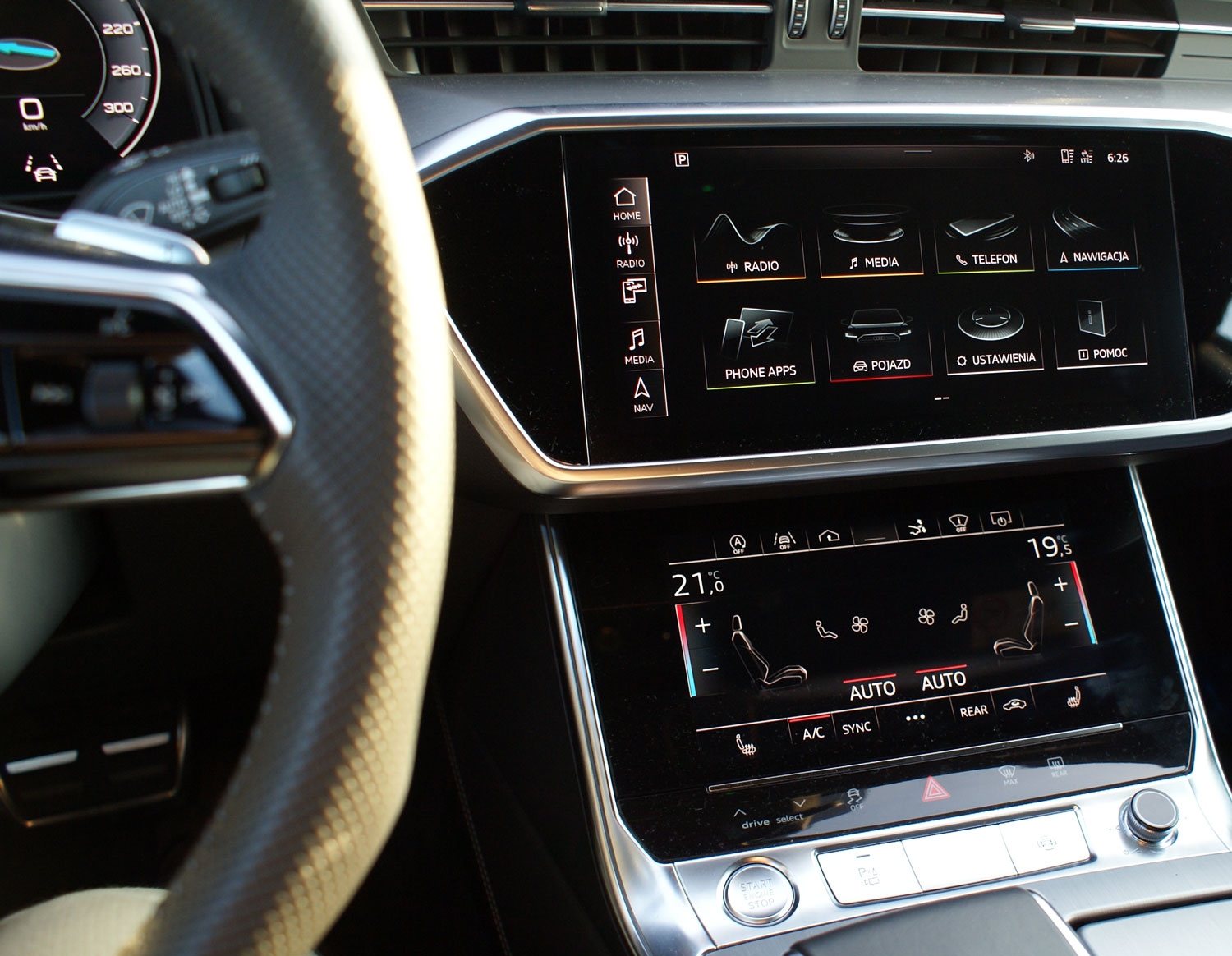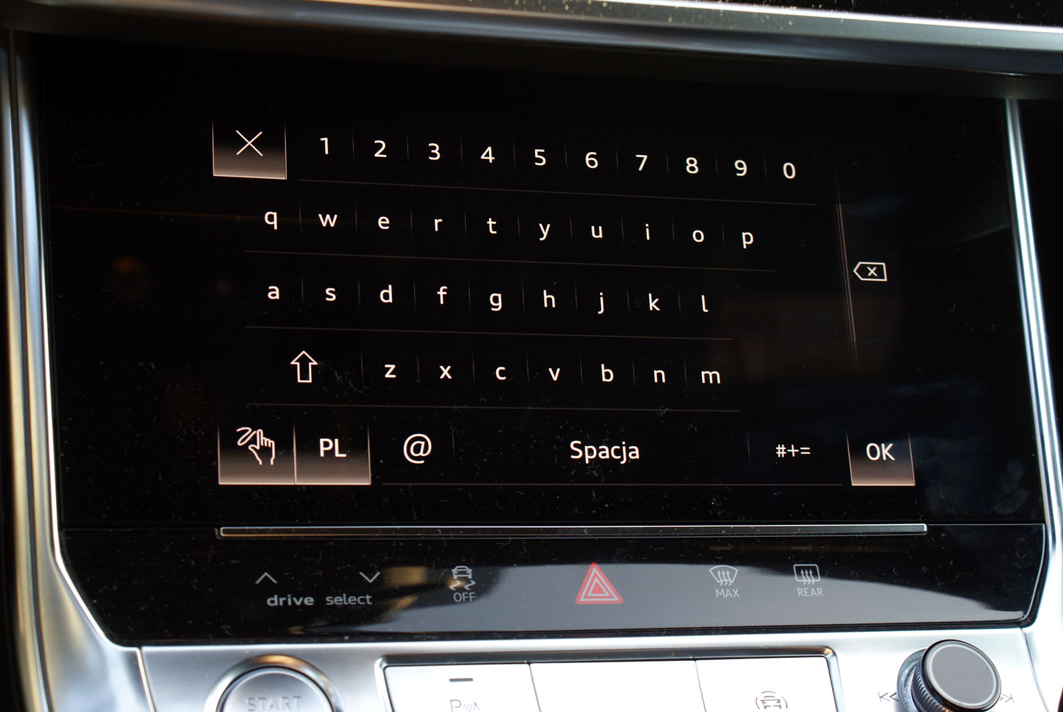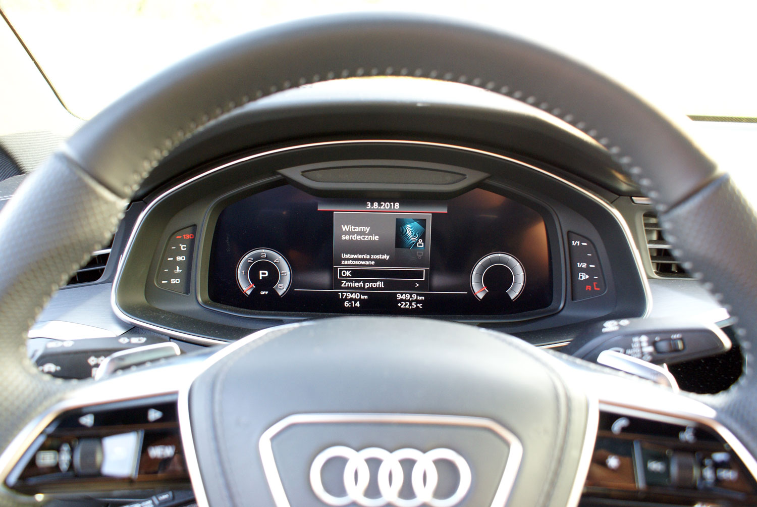 Otwarcie drzwi ujawnia ponadstandardowy system nagłośnieniowy Bang&Olufsen Advanced Sound System wyposażony w 19 głośników o łącznej mocy blisko 2000 W. Całość za jedyne 36 030 zł. Po zajęciu miejsca w fotelu kierowcy przed sobą mamy mnóstwo ekranów. Ten umieszczony za kierownicą, to ekran wirtualnego kokpitu. Ma on przekątną 12,3 cala. Obok, w konsoli centralnej zauważalnie skierowanej w stronę kierowcy widoczne są jeszcze dwa duże ekrany ciekłokrystaliczne. Pierwszy z nich to element systemu MMI Navigation plus – panel dotykowy MMI touch response (18 540 zł). Ekran ten daje dostęp do praktycznie wszystkich funkcji pokładowego systemu inforozrywki, częściowo umożliwia on również diagnostykę auta. Na przykład sprawdzenie poziomu oleju nie oznacza już ryzyka ubrudzenia się bagnetem, wystarczy wybrać jedną z licznych opcji w systemie pokładowym, a komputer dokładnie wyświetli aktualny poziom oleju w silniku. Drugi z ekranów dotykowych umieszczonych w konsoli środkowej auta to głównie panel sterowania klimatyzacją. Może się wydawać, że zastąpienie klasycznych pokręteł panelem dotykowym to przesada, ale Audi zadbało o wbudowanie we wszystkie ekrany dotykowe haptycznej informacji zwrotnej. Po prostu dotknięcie jakiegoś aktywnego elementu ekranu wywołuje wyczuwalną przez użytkownika wibrację, dzięki czemu nie trzeba odrywać wzroku od jezdni w trakcie prowadzenia by zmienić np. nastawy klimatyzacji czy nawigacji.