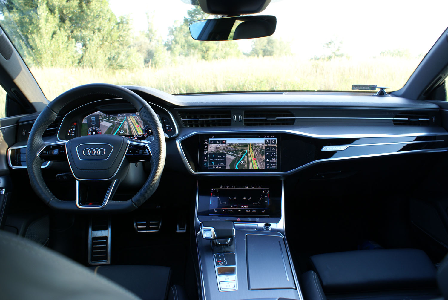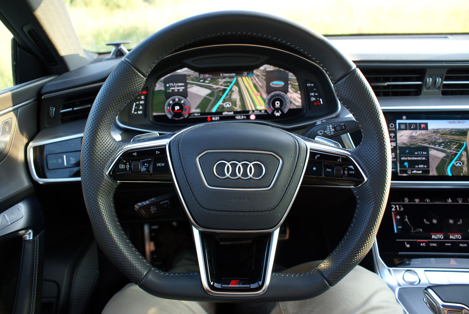 O tym, że A7 to auto komfortowe przekonujemy się natychmiast po otwarciu drzwi i próbie zajęcia fotela kierowcy. Samochód automatycznie odsuwa fotel i ustawia go tak, by wsiadanie było wygodniejsze. Funkcja ta określona w ustawieniach pojazdu jako udogodnienie wsiadania na fotel kierowcy jest domyślnie włączona i stanowi jedną z kilkuset personalizowanych funkcji w testowanym pojeździe. Sam fotel kierowcy, jak i pasażera jest elektrycznie regulowany w niemal każdej płaszczyźnie. A7 z parku prasowego Audi miało tapicerkę skórzaną Valcona z tłoczeniem rombu Audi Sport (opcja w cenie 13 130 zł). Szczerze pisząc spodziewałem się, że w aucie za ponad pół miliona złotych usiądę w fotelu wentylowanym i masażem. Masaży jednak nie było, wentylacji w fotelu również – zainteresowani takimi dodatkami będą musieli dopłacić jeszcze więcej, bo oczywiście stosowne wyposażenie opcjonalne jest w Audi dostępne. Wynikało to jednak z tego, że otrzymaliśmy pojazd doposażony w technologie, komputery i cyfrową inteligencję (w końcu to nas najbardziej interesuje), masaże nie mają z inteligencją nic wspólnego.
