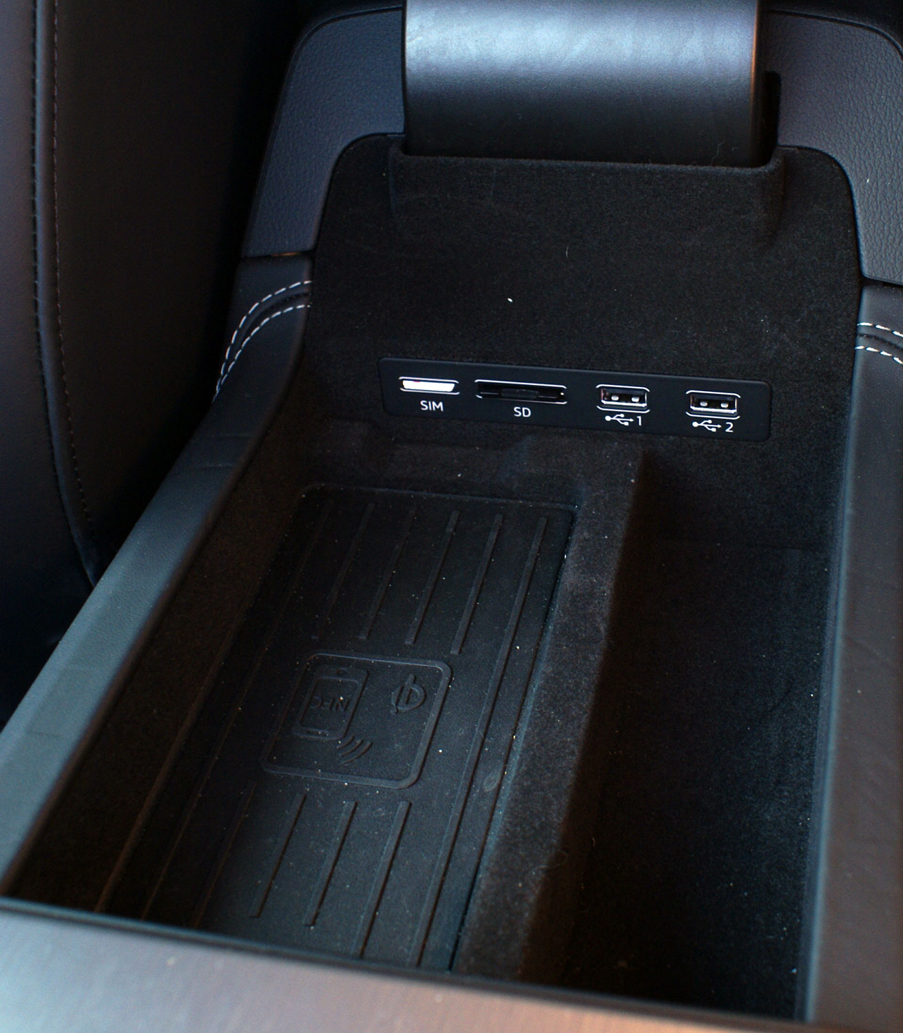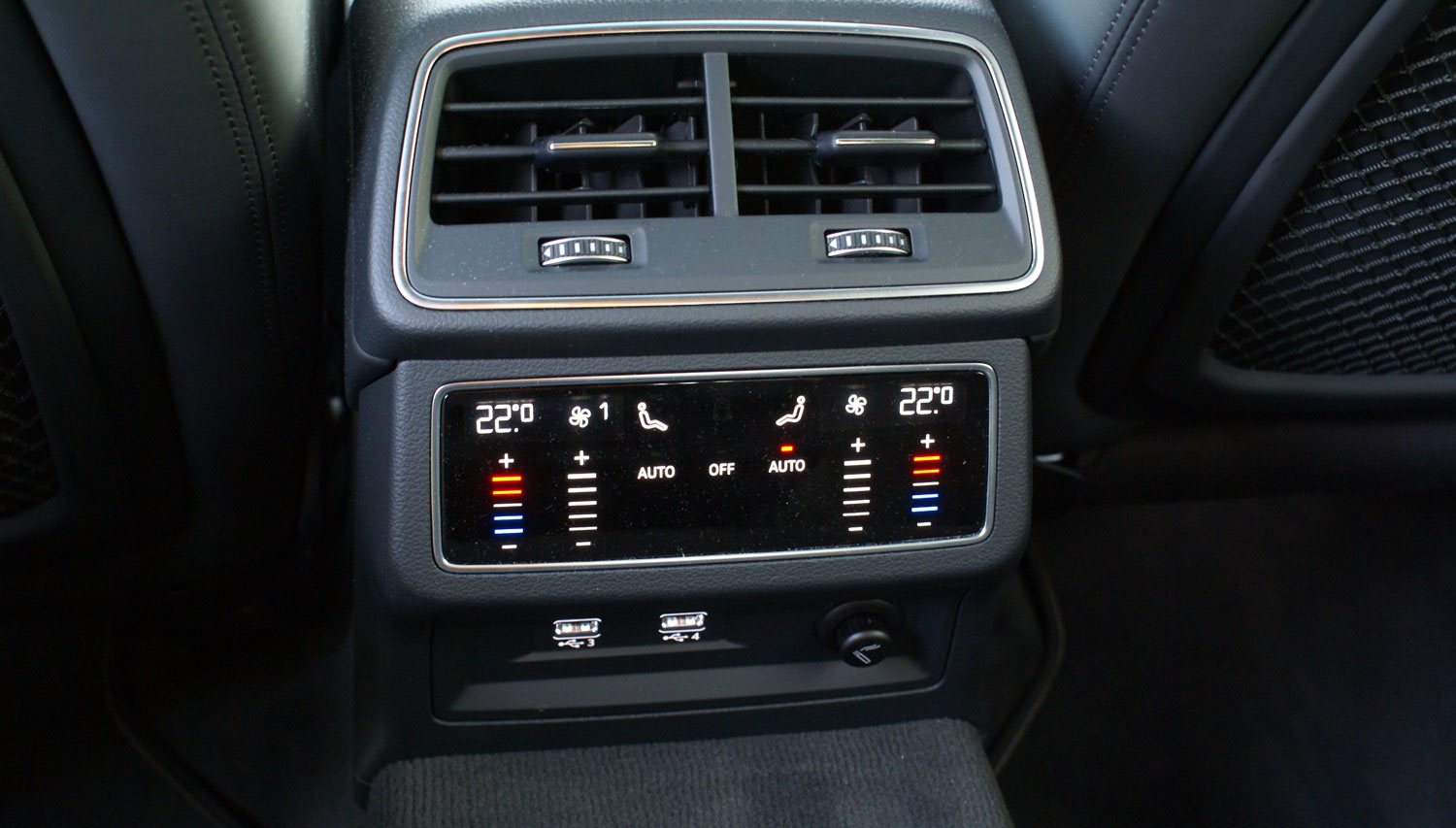 Ekranem dotykowym dysponują również pasażerowie tylnych foteli. Mają oni do swojej dyspozycji dotykowy panel sterowania dwiema kolejnymi strefami klimatyzacji. Oprócz tego w tym miejscu auto testowe było wyposażone w dwa dodatkowe złącza USB oraz gniazdko elektryczne 12V (tzw. gniazdo “zapalniczki”). Klimatyzacja czterostrefowa (dwie strefy z przodu i tyle samo z tyłu) nie jest wyposażeniem standardowym. W testowym egzemplarzu była to opcja wyceniana na 4 470 zł. Również z przodu kierowca bądź pasażer przedniego fotela mają do swojej dyspozycji dwa gniazdka USB, które wraz ze slotem na kartę SIM, kartę SD i ładowarką indukcyjną dla smartfona umieszczono w schowku w podłokietniku.