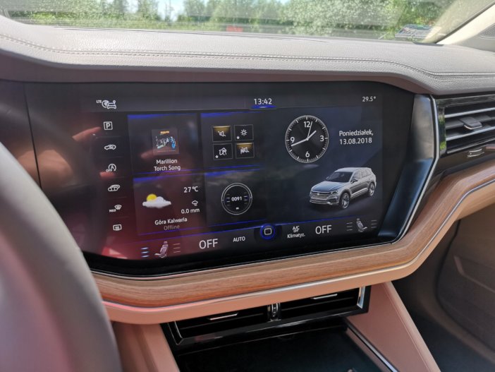 Tak jak w T-Rocu, tak w Touaregu drobny dyskomfort czułem niekiedy w szybkich łukach i zakrętach. Przy prędkości około 100-120 km/h, auto przechylało się lekko na zewnątrz i do tyłu, nawet w trybie sport. Może jest to nieuniknione w samochodzie o takiej masie i wyższym zawieszeniu, zapewne Touareg nie jest wyścigówką sensu stricto, niemniej w tej konkretnej sytuacji przydałoby się więcej stabilności (lub tylko jej wrażenia). Dwukrotnie odmówił nam posłuszeństwa wyświetlacz. W trakcie testów były bardzo wysokie zewnętrzne temperatury przekraczające wyraźnie 30 stopni. Po nagrzaniu się wnętrza w zaparkowanym aucie ekran przestawał na pewien czas reagować na dotyk, urządzeniu pomogła dopiero klimatyzacja. Jednak i ją niełatwo było włączyć, bo w Touaregu prawie wszystkim steruje się za pomocą komputera pokładowego właśnie z poziomu dotykowego modułu. Fizyczną regulację klimatyzacji znaleźliśmy jednak w tylnej części kabiny. Przydałby się awaryjny, zwykły potencjometr w zasięgu kierowcy.