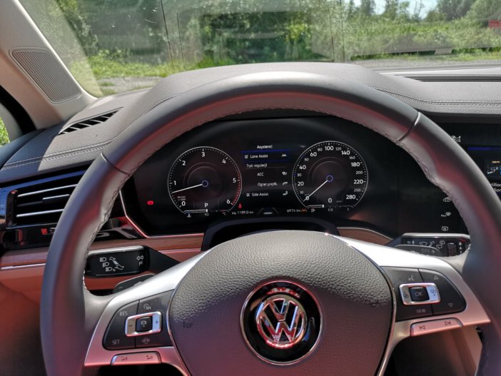 Jako że poruszamy się supernowoczesnym samochodem klasy premium, mamy też możliwość korzystania z funkcji autonomicznych. Poza klasycznymi już na tej półce: kontrolą trakcji, asystentem parkowania, czujnikami dookoła samochodu, sygnalizacją martwych punktów i ostrzeżeniami w potencjalnie groźnych sytuacjach – jest jeszcze samoprowadzenie auta. Touareg potrafi utrzymywać się w swoim pasie, jeśli są wyraźnie wymalowane linie po obu stronach, jednak co pewien czas samochód będzie wymagał od kierowcy dotknięcia kierownicy. Auto dopasuje też prędkość do pojazdu przed nami. Czujniki radarowe umieszczone z przodu auta pomogą podczas wjeżdżania na skrzyżowanie z ograniczoną widocznością i zasygnalizują to, czego nie widzi jeszcze prowadzący. Przy małej prędkości system zainicjuje nawet hamowanie.