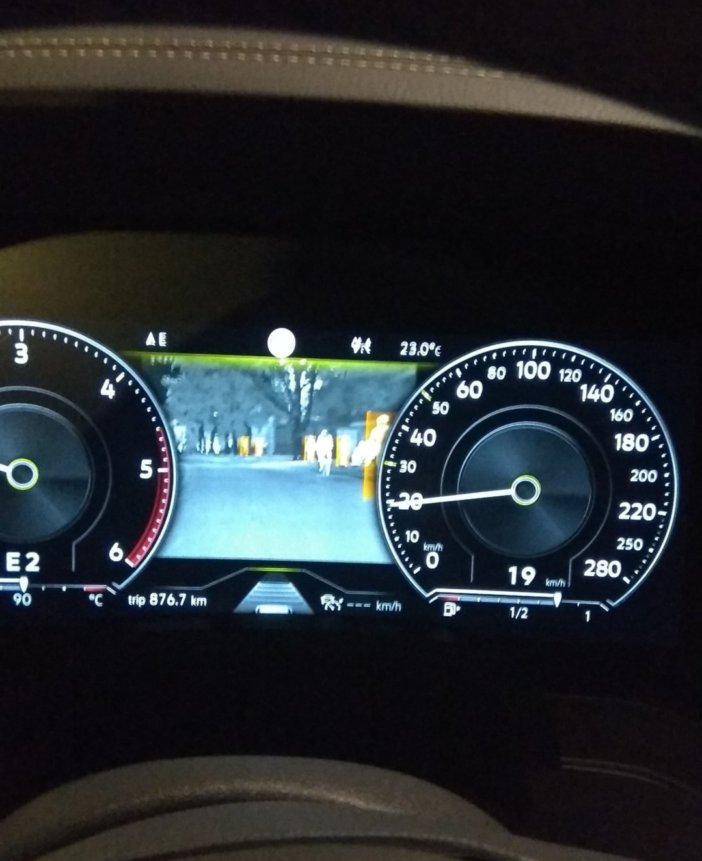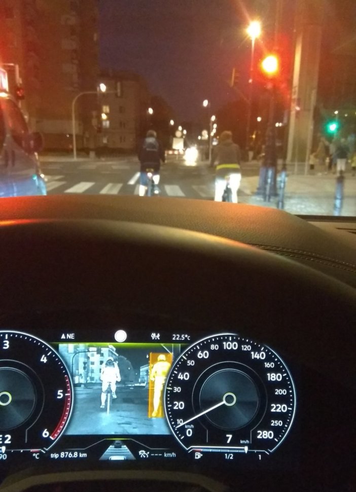 Jednak najciekawsza funkcja technologiczna tego samochodu, będąca nie tylko efektem czy błyskiem luksusu, to kamera termowizyjna. W pierwszej chwili, kiedy o niej usłyszałem, sądziłem, że będzie raczej zabawką, ciekawą, ale niepraktyczną. Tymczasem urządzenie może być niesłychanie przydatne w sytuacji, która stresuje każdego kierowcę. Jedziemy w nocy nieoświetloną drogą, bez pobocza i chodnika, pomiędzy małymi miejscowościami, dodatkowo jeszcze np. we mgle. Wiele osób chodzi w takich miejscach bez żadnego własnego oświetlenia lub odblasków. Nieraz zauważałem w tych warunkach przechodniów dopiero, kiedy mijałem ich już blisko. Night Vision w Touaregu rejestruje ludzi i zwierzęta ze znacznej odległości, większej niż zasięg krótkich świateł (kamera termowizyjna widzi na 130 metrów). Piesi pojawiają się na ekranie na wprost kierowcy w kontrastowym, jasnym kolorze. System dodatkowo oznacza te sylwetki, na które z racji ich usytuowania oraz toru jazdy trzeba szczególnie uważać. W razie potrzeby wysyła kierowcy dodatkowe ostrzeżenia. Naprawdę znakomite rozwiązanie.