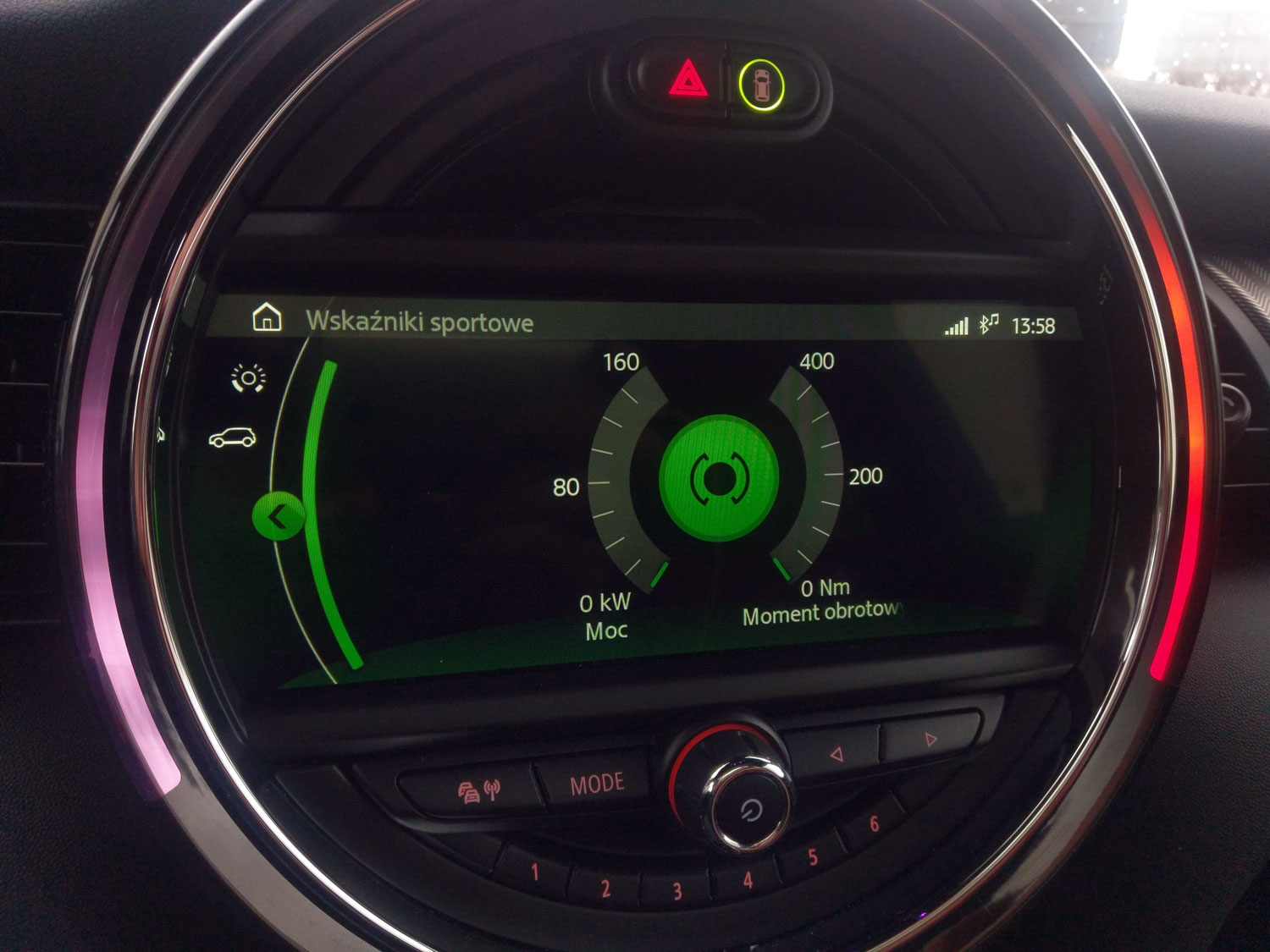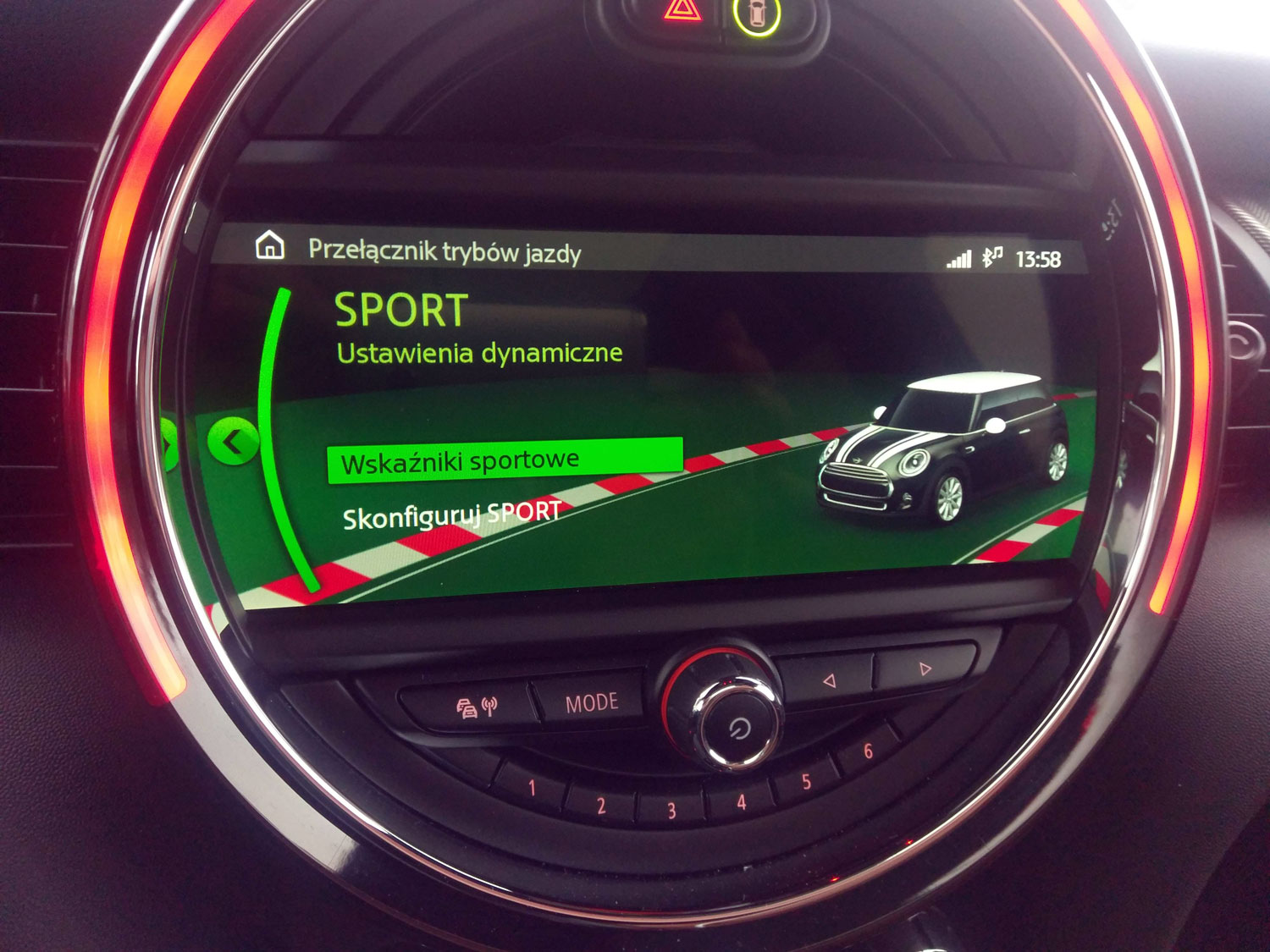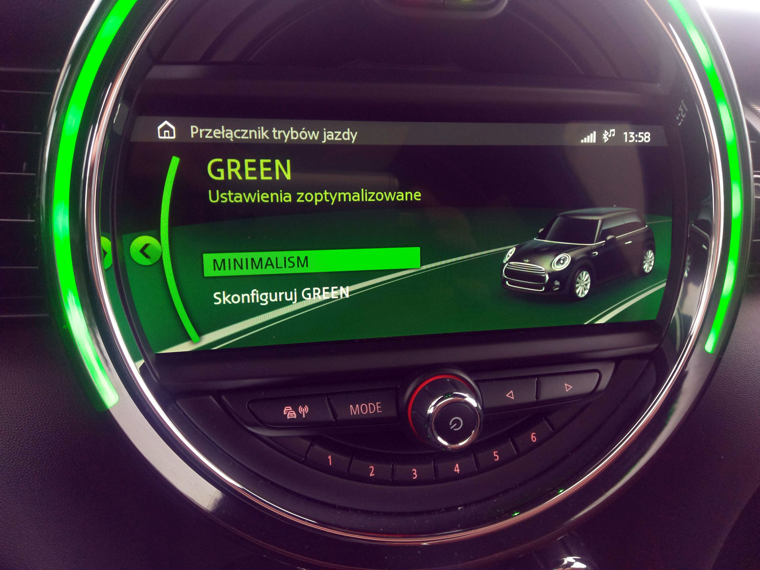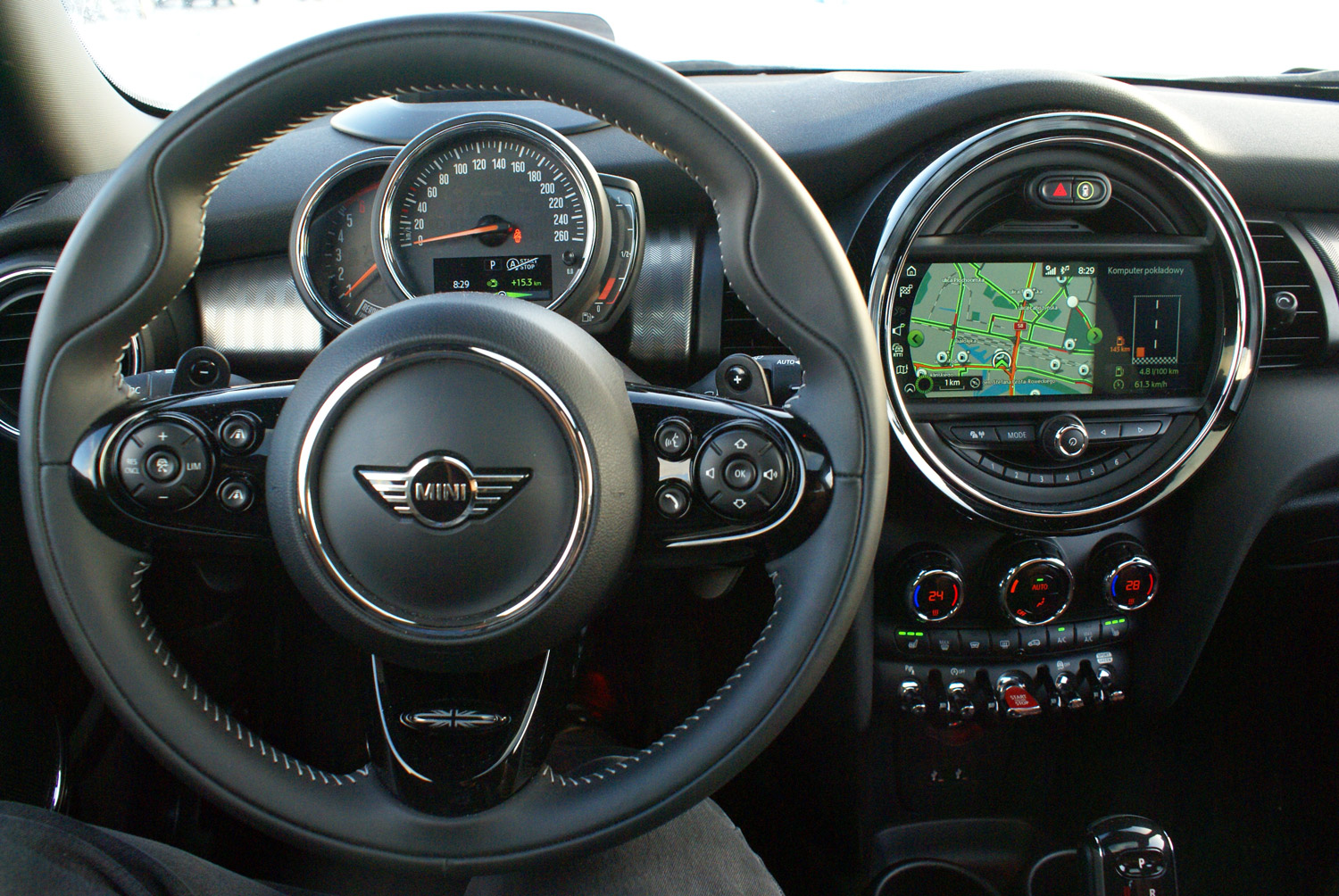 Kokpit Mini, mimo że znacznie nowocześniejszy niż w starszych wersjach, nie został pozbawiony fizycznych przycisków i przełączników. Wręcz można napisać, że stanowią one o klasycznym stylu tego pojazdu. Przycisk Start/Stop uruchamiający silnik, czy przyciski uaktywniające m.in. asystenta parkowania, sterujące kontrolą trakcji czy przełączające pomiędzy trzeba dostępnymi w tym aucie trybami prowadzenia (Green, Mid i Sport) wyglądają bardzo fajnie, jednoznacznie kojarząc się z przełącznikami w autach sportowych.