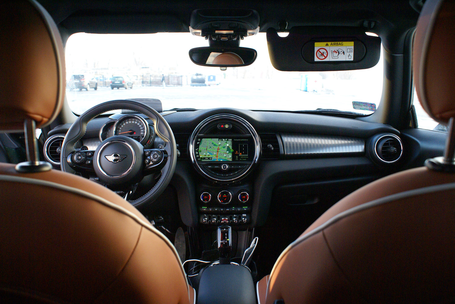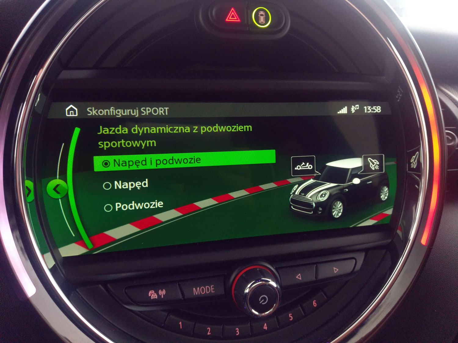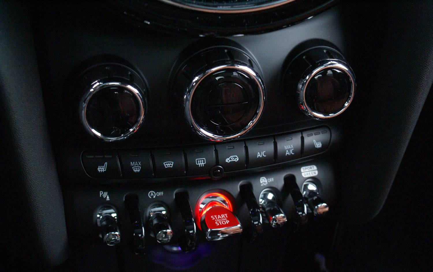 Kokpit Mini, mimo że znacznie nowocześniejszy niż w starszych wersjach, nie został pozbawiony fizycznych przycisków i przełączników. Wręcz można napisać, że stanowią one o klasycznym stylu tego pojazdu. Przycisk Start/Stop uruchamiający silnik, czy przyciski uaktywniające m.in. asystenta parkowania, sterujące kontrolą trakcji czy przełączające pomiędzy trzeba dostępnymi w tym aucie trybami prowadzenia (Green, Mid i Sport) wyglądają bardzo fajnie, jednoznacznie kojarząc się z przełącznikami w autach sportowych.