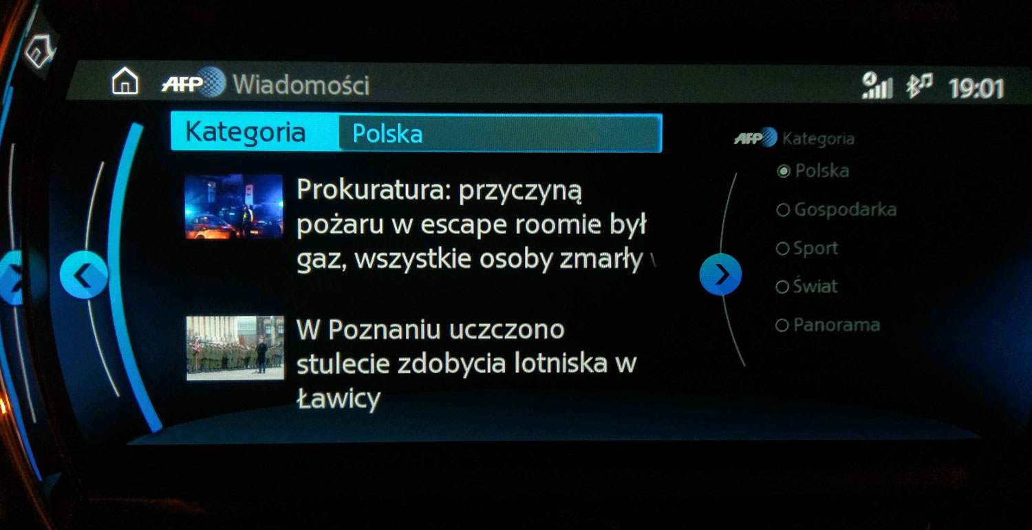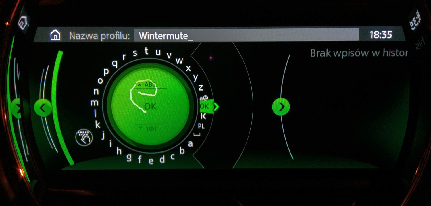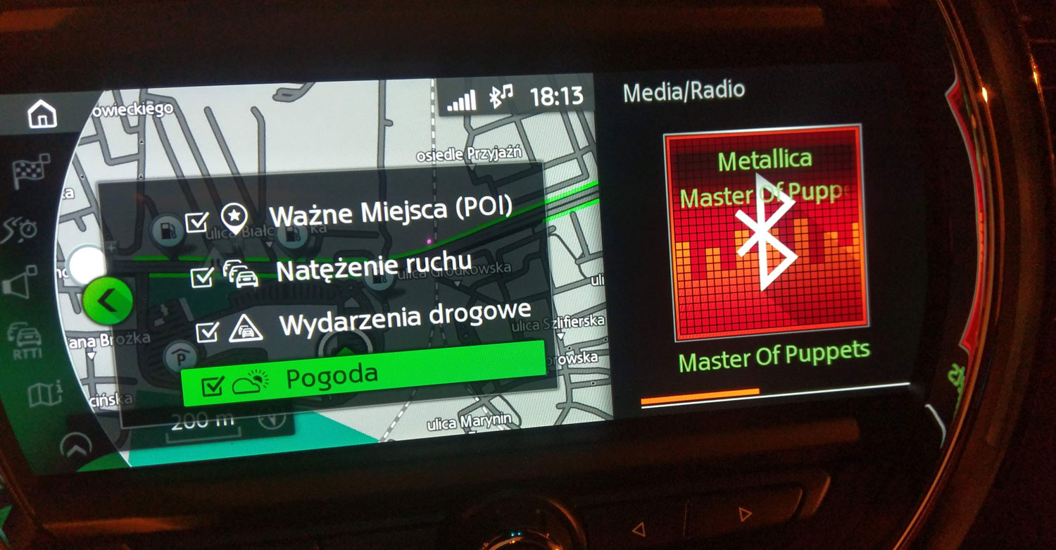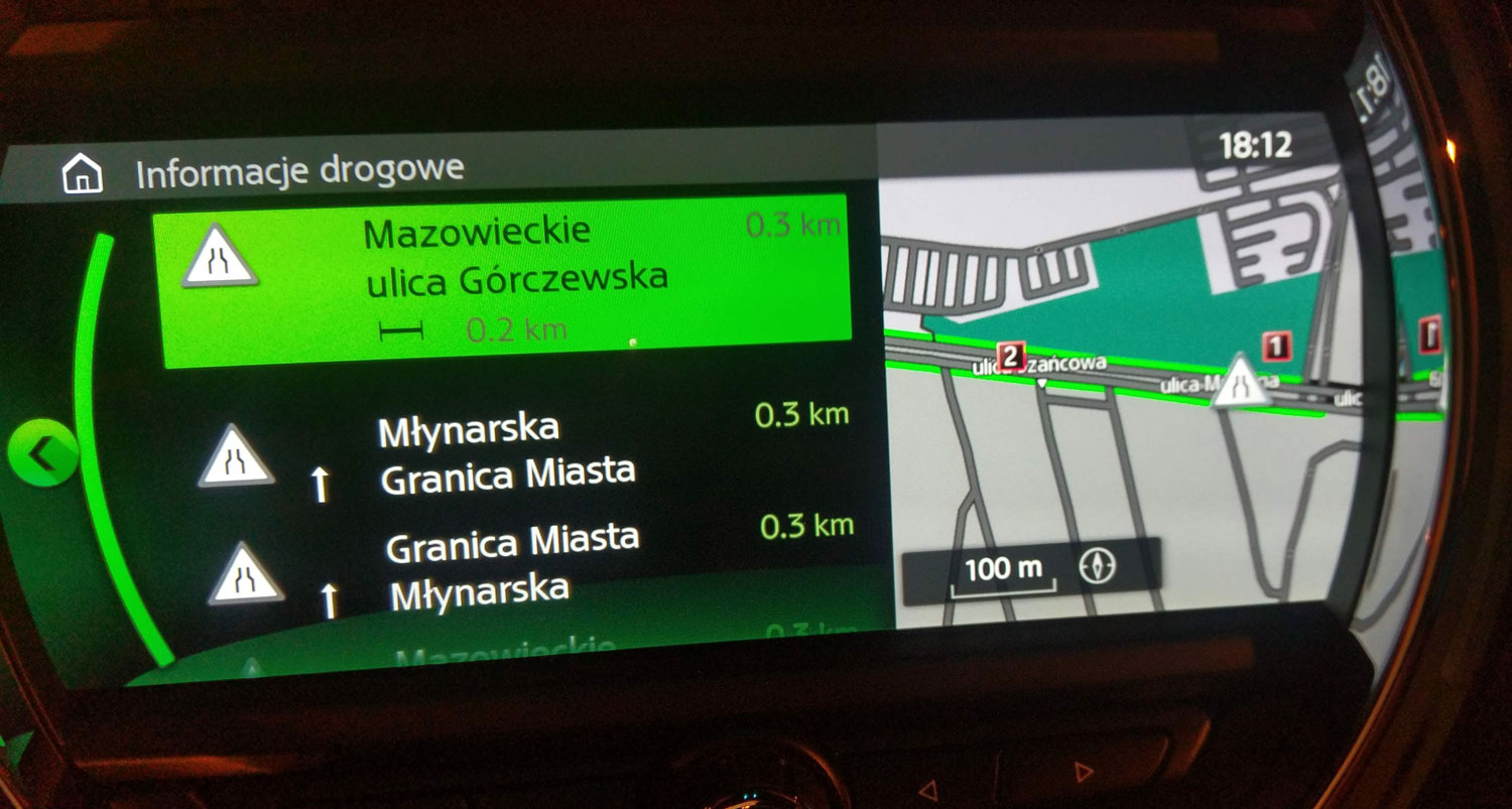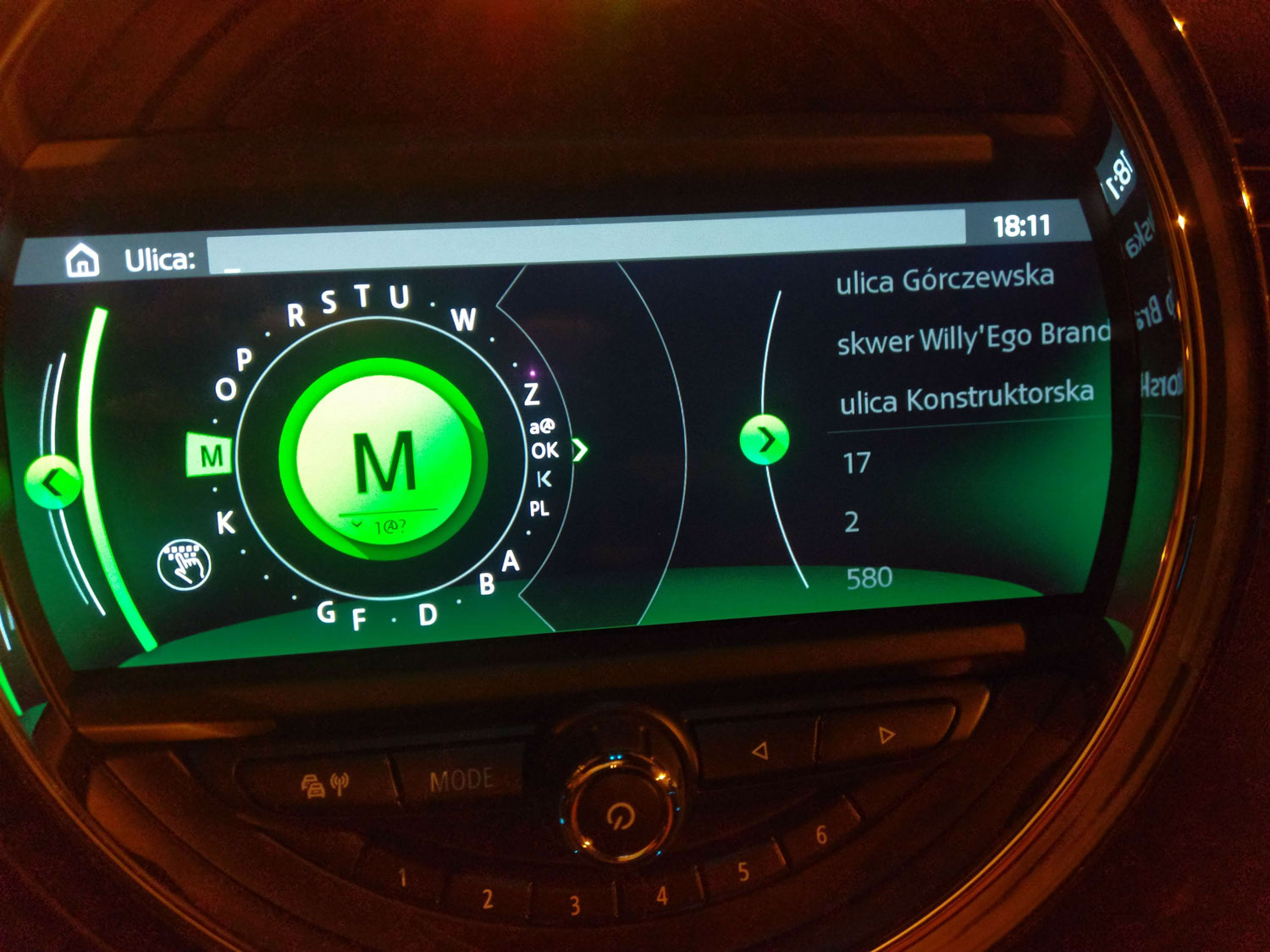 Warto tu jeszcze dodać, że system elektroniczny Mini, oprócz ekranu dotykowego, interfejsu głosowego (nie działającego niestety po polsku), kierownicy wielofunkcyjnej, czy paneli z przyciskami na konsoli centralnej, udostępnia jeszcze jeden sposób wprowadzania informacji do komputera pokładowego. Na przykład wyszukując nazwę ulicy możemy wybierać poszczególne litery alfabetu za pomocą kółka kontrolera Mini Touch umieszczonego przed gałką automatycznej skrzyni biegów, ale można też ręcznie wpisać potrzebną nam nazwę ulicy wykorzystując palec oraz gładką powierzchnię wspomnianego kołowego manipulatora. Powierzchnia Mini Touch reaguje na dotyk i jest w stanie rozpoznać kreślony przez kierowcę kształt liter. Z oczywistych względów rozwiązanie to przeznaczone jest raczej dla osób praworęcznych. Dzięki stałej łączności Mini ze światem, wbudowany system nawigacyjny uwzględnia aktualne natężenie ruchu, czy wydarzenia drogowe (remonty dróg, zmiana organizacji ruchu, wypadki i inne zdarzenia drogowe, czasowe objazdy itp.) dopasowując optymalną trasę do faktycznych warunków na drodze do ustawionego celu. O tym, że za pomocą pokładowego komputera możemy czytać wiadomości ze świata, czy uzyskiwać informacje o pogodzie nie ma co pisać – to cecha typowa dla wszystkich samochodów, które są podłączone do internetu.