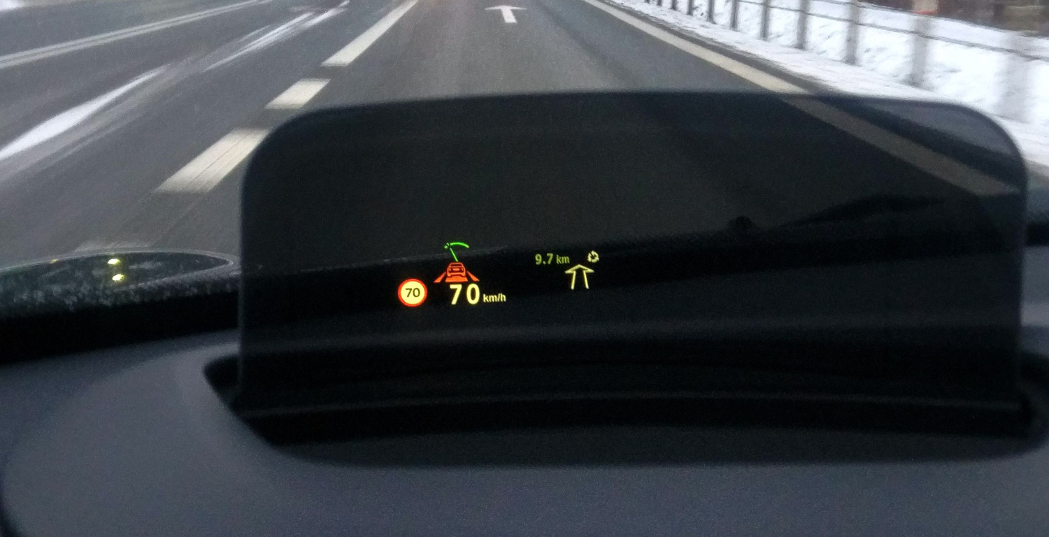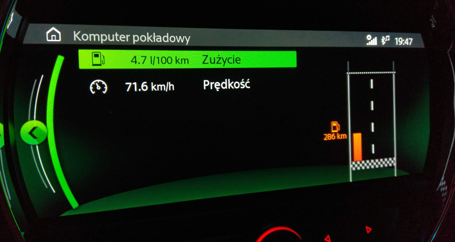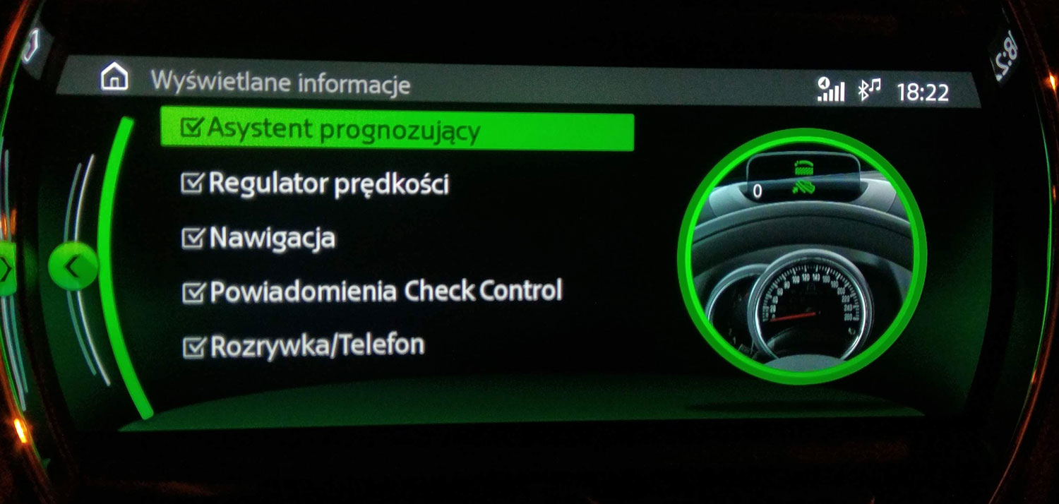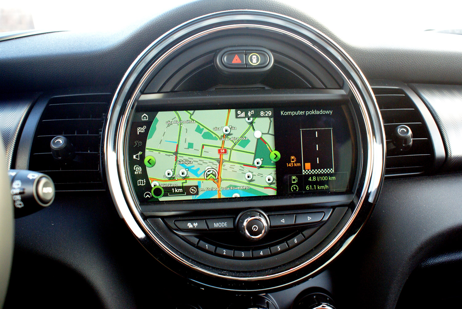 Kolejnym elektronicznym elementem wyposażenia uzupełniającym warstwę informacyjną auta (czyli urządzenia i funkcje dostarczające kierowcy i pasażerom informacji o otoczeniu, funkcjach pojazdu itp.) jest oczywiście tablica rozdzielcza. Tutaj Mini zastosowało analogowy zestaw wskaźników uzupełniony o cyfrowe, w pełni konfigurowalne wskaźniki. To kierowca decyduje czy np. w ramce LCD widocznej pod prędkościomierzem ma być wyświetlana np. średnia prędkość, średnie zużycie paliwa czy inne parametry. Kolejnym ekranem w jaki wyposażony był egzemplarz testowy Mini Cooper SD był wyświetlacz HUD w postaci przezroczystej płytki wysuwającej się z kokpitu przed oczami kierowcy. Zakres informacji prezentowanych na ekranie HUD zależy od aktualnie aktywnych funkcji pojazdu, ale może być całkiem spory. Np. w trakcie korzystania z wbudowanych w Mini systemów asystujących i adaptacyjnego tempomatu, na wspomnianym ekranie zobaczymy m.in. aktualnie rozpoznaną (analiza znaków drogowych) dopuszczalną prędkość ew. inne zakazy (np. zakaz wyprzedzania), bieżącą prędkość pojazdu, nastawy tempomatu, wskazania asystenta utrzymania pasa ruchu, odległość do najbliższego punktu nawigacyjnego na ustawionej w nawigacji trasie itp.