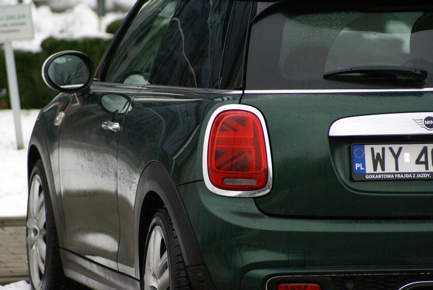Niemcy przygotowali pojazd, który wydaje się być bardziej brytyjski niż Królowa Elżbieta. Już sama sylwetka kojarzy się z brytyjskim protoplastą, ale nie zabrakło też dodatkowych smaczków, takich jak chociażby specyficznie wystylizowane tylne światła LED, które razem tworzą doskonale rozpoznawalny wzór Union Jack, czyli brytyjskiej flagi. W testowanym egzemplarzu diodowe były również reflektory przeciwmgielne, stanowiące jeden z licznych składników opcjonalnego pakietu wyposażeniowego John Cooper Works Trim (19 231 zł). Charakterystyczny, zielony lakier, nazywa się oczywiście British Racing Green Metallic, również stanowi opcjonalne wyposażenie, kosztujące 2206 zł. Byłbym zapomniał, za białe pasy na pokrywie silnika, także trzeba dopłacić (486 zł). Dopłaty nie wymaga natomiast biały dach i białe lusterka zewnętrzne. Inna sprawa, że w testowanym modelu dach był nie tylko biały, ale i szklany, panoramiczny, co kosztuje dodatkowe 3968 zł. Również zauważalna na pierwszy rzut oka przyciemniana tylna szyba i również przyciemniane boczne szybki z tyłu to opcja za 1321 zł.