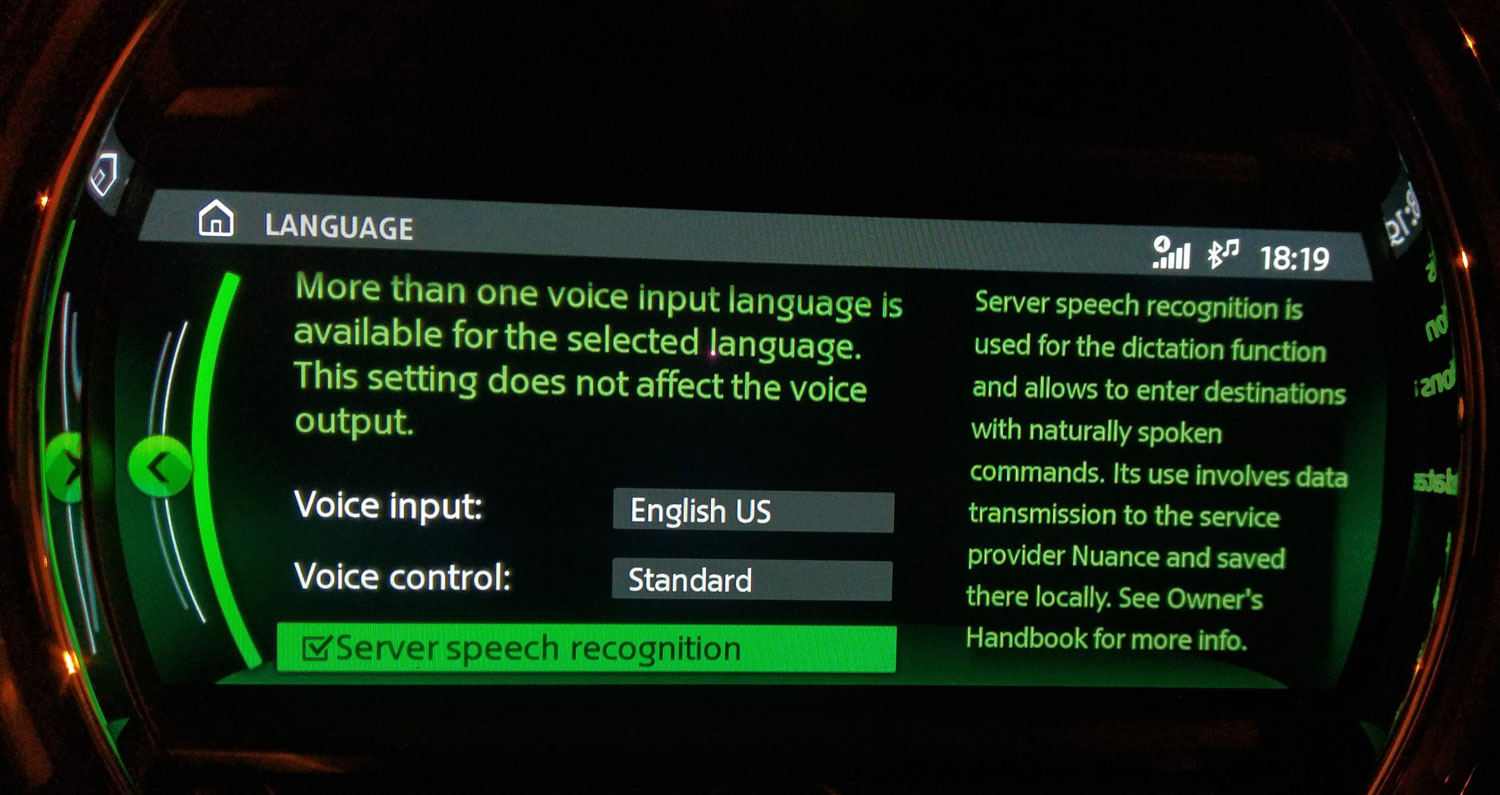 Gdy zajmiemy miejsce w wygodnym fotelu kierowcy, przed oczami mamy kolejną nowość w wersji poliftingowej Mini. Chodzi o wielofunkcyjną kierownicę, która w testowym egzemplarzu miała jeszcze efektowne skórzane obszycie (pakiet John Cooper Works Trim). Za pomocą tej kierownicy możemy m.in. uruchamiać adaptacyjny tempomat współpracujący z wbudowanym w ten pojazd radarem i kamerą analizującą to co się dzieje z przodu pojazdu, albo klasyczny ogranicznik prędkości. Oprócz tego mamy po lewej stronie jeszcze przyciski ustawiające automatyczną odległość pomiędzy Mini, a pojazdem poprzedzającym. Adaptacyjny tempomat w Mini pracuje od prędkości wyższej od 30 km/h. To niby nic nadzwyczajnego, gdyż tak jest w wielu autach, ale w połączeniu z automatyczną kontrolą prędkości ma w tym przypadku pewne konsekwencje, do których jeszcze wrócę. Z prawej strony kierownicy znajdują się przyciski sterujące funkcjami telefonicznymi, zmieniające widok na ekranie systemu inforozrywki w konsoli centralnej, regulację głośności, możliwość zmiany kanału radia czy np. aktualnie odtwarzanego utworu z usługi Spotify uruchomionej na sparowanym z pokładową elektroniką smartfonie kierowcy. Obecność automatycznej skrzyni biegów uwalnia kierowcę od samodzielnej zmiany przełożeń, ale gdyby ten miał życzenie samodzielnie przerzucać biegi, może to zrobić za pomocą zamieszczonych przy kierownicy łopatek zmiany przełożeń. Niech Was nie zmyli widoczny na poniższych zdjęciach, umieszczony na kierownicy przycisk z naszkicowaną buźką. Oczywiście oznacza on aktywację mechanizmu rozpoznawania mowy, który działa świetnie o ile płynnie mówimy językiem Szekspira (bądź kilkoma innymi, ale – niestety – nie polskim). Jeżeli chcemy korzystać z interfejsu głosowego, jest to możliwe po przełączeniu języka całego systemu na angielski (lub jeden z języków zgodnych z funkcją rozpoznawania mowy). Tak długo jak systemem interfejsów pokładowych pozostaje polski, dyktowanie poleceń i komunikacja głosowa z autem nie jest możliwa.