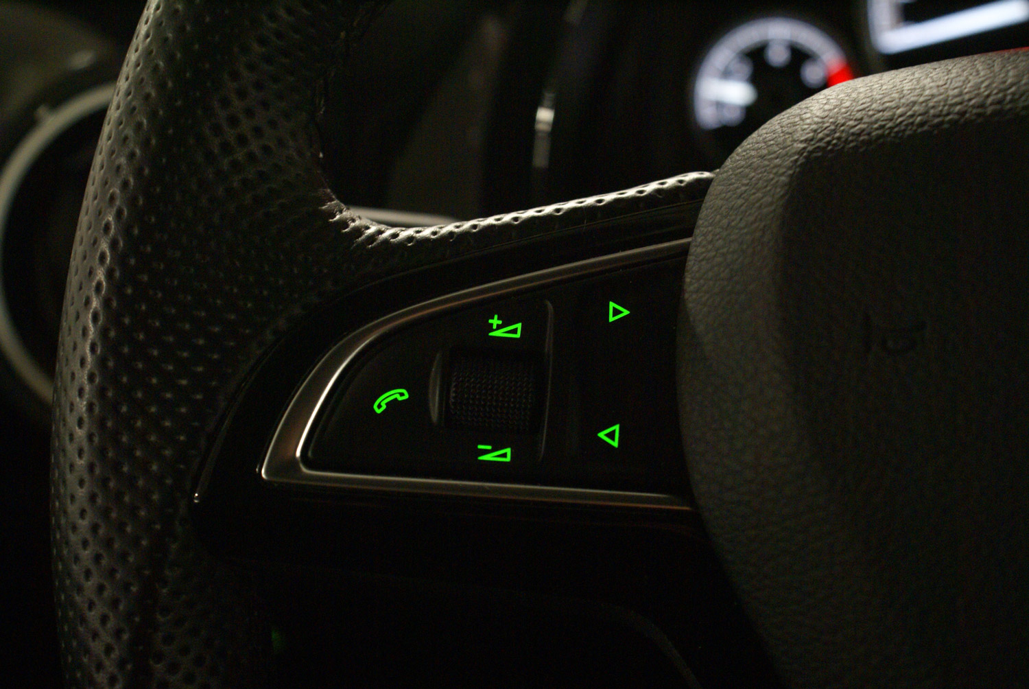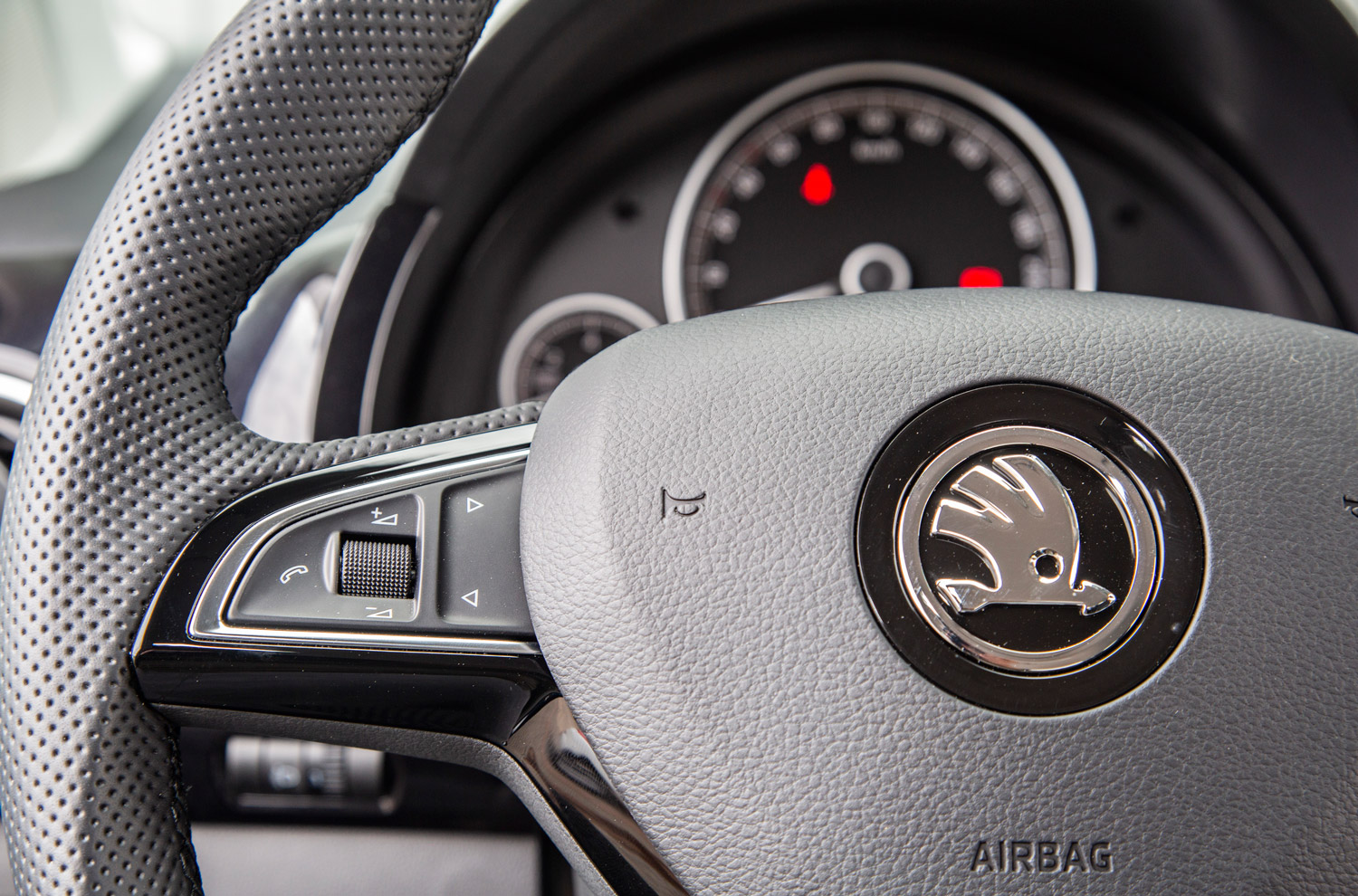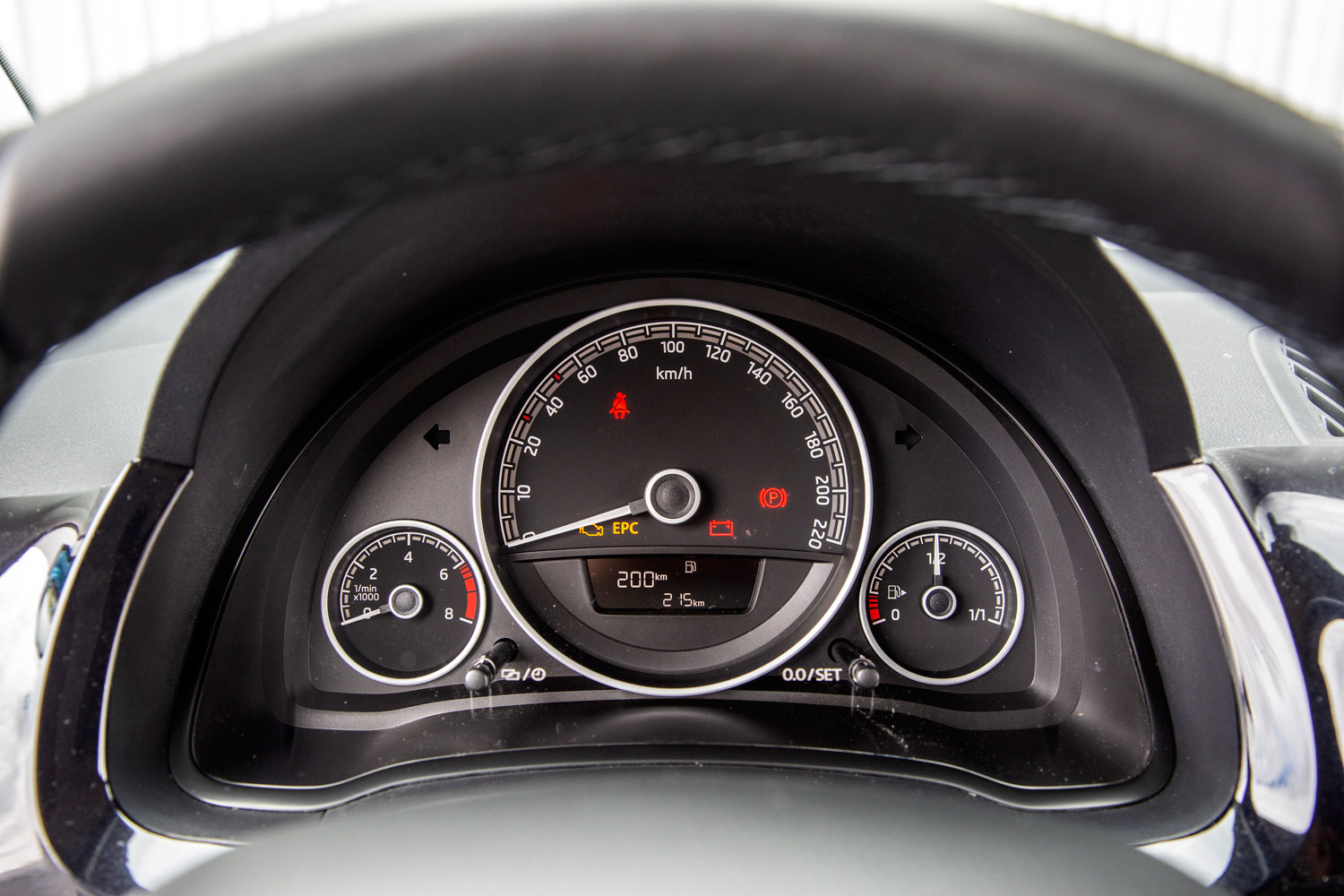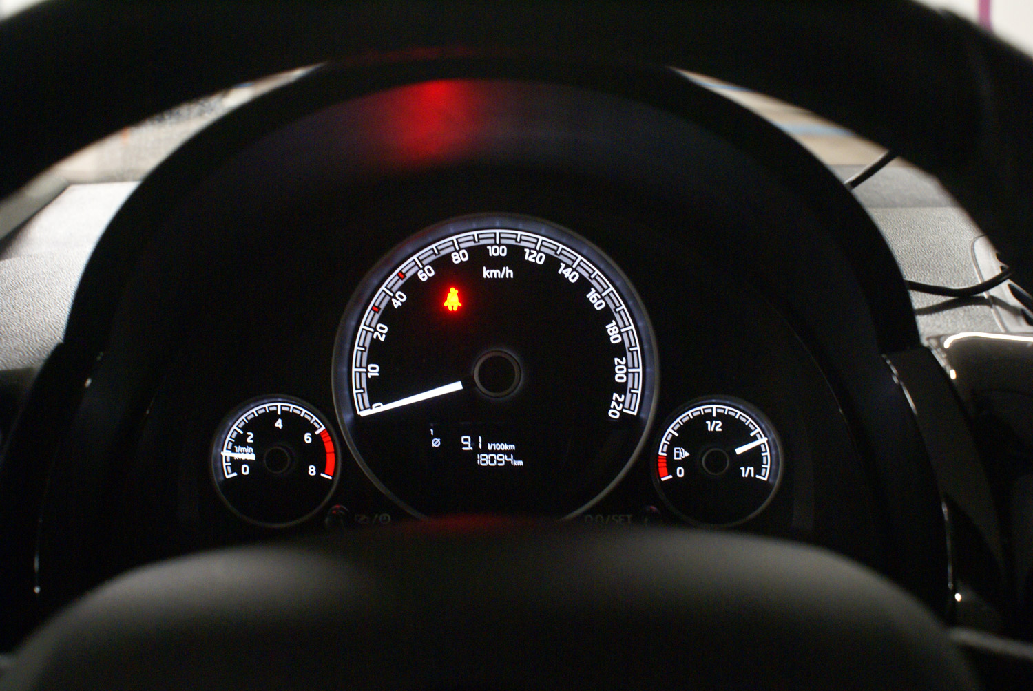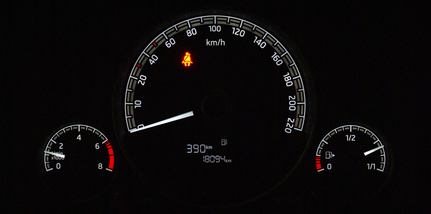 Automatyczne światła, czyli mechanizm automatycznie włączający – w zależności od panujących warunków zewnętrznych – światła do jazdy dziennej lub normalne światła mijania, z których korzystamy po zmroku, to wyposażenie opcjonalne, które otrzymujemy w pakiecie razem z wspomnianym wcześniej systemem Citi Safe Drive. Do sterowania skromną, ale obecną w kokpicie elektroniką możemy wykorzystać wielofunkcyjną kierownicę trójramienną. Za jej pomocą możemy np. zmieniać głośność aktualnego źródła dźwięku, zmieniać kanały radia czy utwory np. z playlisty odtwarzanej z usługi Spotify uruchomionej na sparowanym z samochodem smartfonie. Oprócz tego kierownica daje dostęp do funkcji telefonu. Oczywiście nie chodzi o wewnętrzny samochodowy telefon (karta SIM zintegrowana z pokładowym systemem elektronicznym), bo czegoś takiego w małym Citigo, nie ma. Chodzi po prostu o łatwiejsze korzystanie z naszego smartfonu, sparowanego z komputerem pokładowym. Tablica rozdzielcza w tym aucie jest w zasadzie całkowicie “analogowa” mamy co prawa umieszczony w kole prędkościomierza niewielki monochromatyczny wyświetlacz LCD (dostarczający m.in. informacji o zasięgu, średniej prędkości, średnim zużyciu paliwa itp.), ale główne wskaźniki: prędkości, obrotów i poziomu paliwa, to klasyczne tarcze.