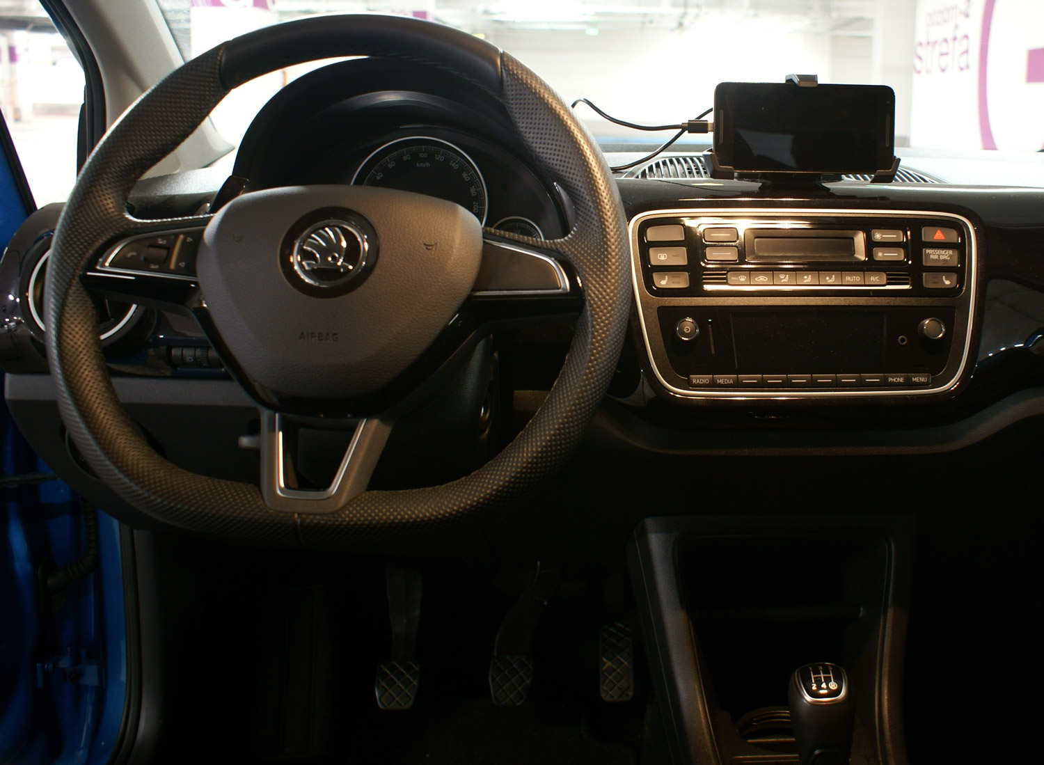 W konsoli centralnej testowanego modelu znaleźliśmy fabrycznie zamontowany uchwyt na smartfon – tak skonstruowany, że bez problemu powinniśmy dopasować do niego smartfon o dowolnych gabarytach. Poniżej uchwytu widoczne są: panel klimatyzacji oraz konsola radia SWING. Radio to zdolne jest do odtwarzania zarówno kanałów radiowych, jak i cyfrowej muzyki zapisanej w plikach MP3 (np. na nośniku podłączanym do gniazda USB), na karcie SD, odtwarzanej strumieniowo via smartfon i uruchomionej w nim usłudze (np. Muzyka Google Play, Spotify, Deezer itp.). Oprócz tego źródłem dźwięku może być dowolny sprzęt podłączany przez gniazdo AUX In (ma ono postać klasycznego gniazda na minijack 3,5 mm). Multimedialny system SWING w testowanej Škodzie Citigo Style wyposażony był w prosty, kolorowy ekranik i zintegrowany z sześciogłośnikowym zestawem nagłośnieniowym, do którego zainteresowani opcjonalnie mogą dokupić również umieszczany w bagażniku subwoofer (300 W), z tym że wtedy obecność subwoofera wyklucza koło zapasowe lub ewentualnie instalację LPG.