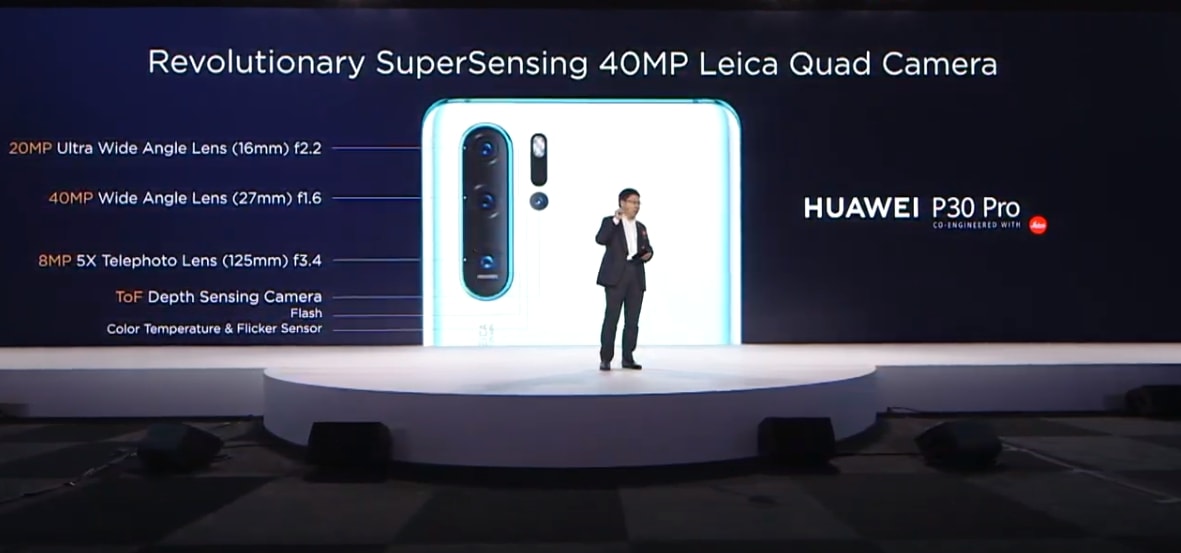 Główny nacisk położono na możliwości fotograficzne. P30 Pro to pierwszy smartfon wyposażony w sensor RYYB, który może rejestrować do 40% więcej światła. W połączeniu z podwójną stabilizacją optyczną, ISO na poziomie 409600 (4-krotnie więcej niż w P20 Pro) i sztuczną inteligencją smartfon pozwala wykonać z ręki wysokiej jakości zdjęcia nocne, nawet z długim czasem naświetlania. Cztery obiektywy w smartfonie dają użytkownikowi dużą swobodę. Do wyboru mamy główny obiektyw o rozdzielczości 40 MP i przysłonie f/1.5, szerokokątny obiektyw o rozdzielczości 20MP i przysłonie f/2.2, teleobiektyw o rozdzielczości 8MP i kamerę typu ToF do mierzenia odległości, która odpowiada za efekt rozmycia tła, a także do tworzenia trójwymiarowych modeli.