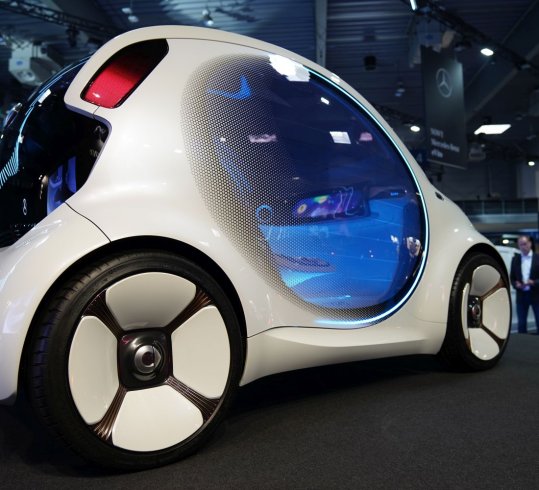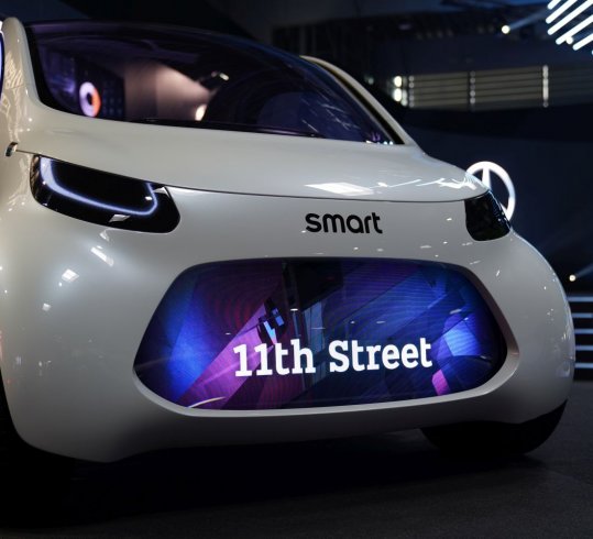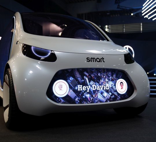 Przyznaję, że nie bardzo zrozumiałem zamysł projektantów koncepcyjnego Smarta, który z przodu wyświetlał różne komunikaty – informacja dla pieszych? Rozpoznawanie znajomych na ulicy? Cóż, koncepcyjne modele mają się wyróżniać i to zadanie model EQ Vision fortwo zdecydowanie spełnił. Z kolei Mercedes EQC 400 4Matic to auto jak najbardziej praktyczne i świetnie wyposażone. Zasięg deklarowany (WLTP) to 450 km, przyśpieszenie 5,1 s do 100 km/h. Oczywiście za interakcję pojazdu z kierowcą odpowiada MBUX, czyli inteligentny system pokładowy z rozpoznawaniem głosu i sztuczną inteligencją.