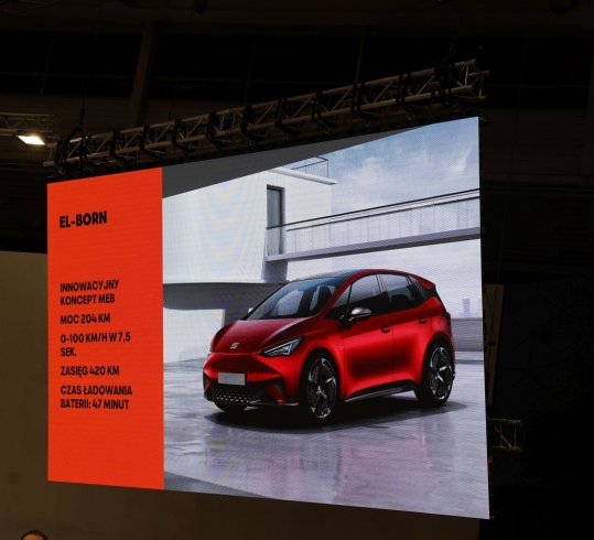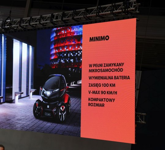 Seat pochwalił się również swoimi planami w zakresie elektromobilności – niestety auta (na razie koncepty) pokazano jedynie na slajdach podczas prezentacji. Chodzi o model Seat El-Born, kompaktowe auto elektryczne zbudowane na wspomnianej wcześniej platformie MEB – ma zapewniać zasięg 420 km, a dzięki mocy 204 KM, pierwsze 100 km/h pojazd ma osiągać w 7,5 sekundy. Szczególnie imponujący był czas ładowania akumulatorów – 47 minut. Ciekawe jak będzie w praktyce. Kolejnym autem jest studyjny mikrosamochód (jednoosobowy!) Seat Minimo. To w zasadzie skuter, tyle że w pełni zamykany i dwuosiowy. Zasięg elektrycznego napędu do 100 km, prędkość maksymalna 90 km/h – idealny do miasta? Slajdy pokazujące oba modele znajdziecie w poniższej galerii zdjęć jakie zrobiłem na stoisku Seata.